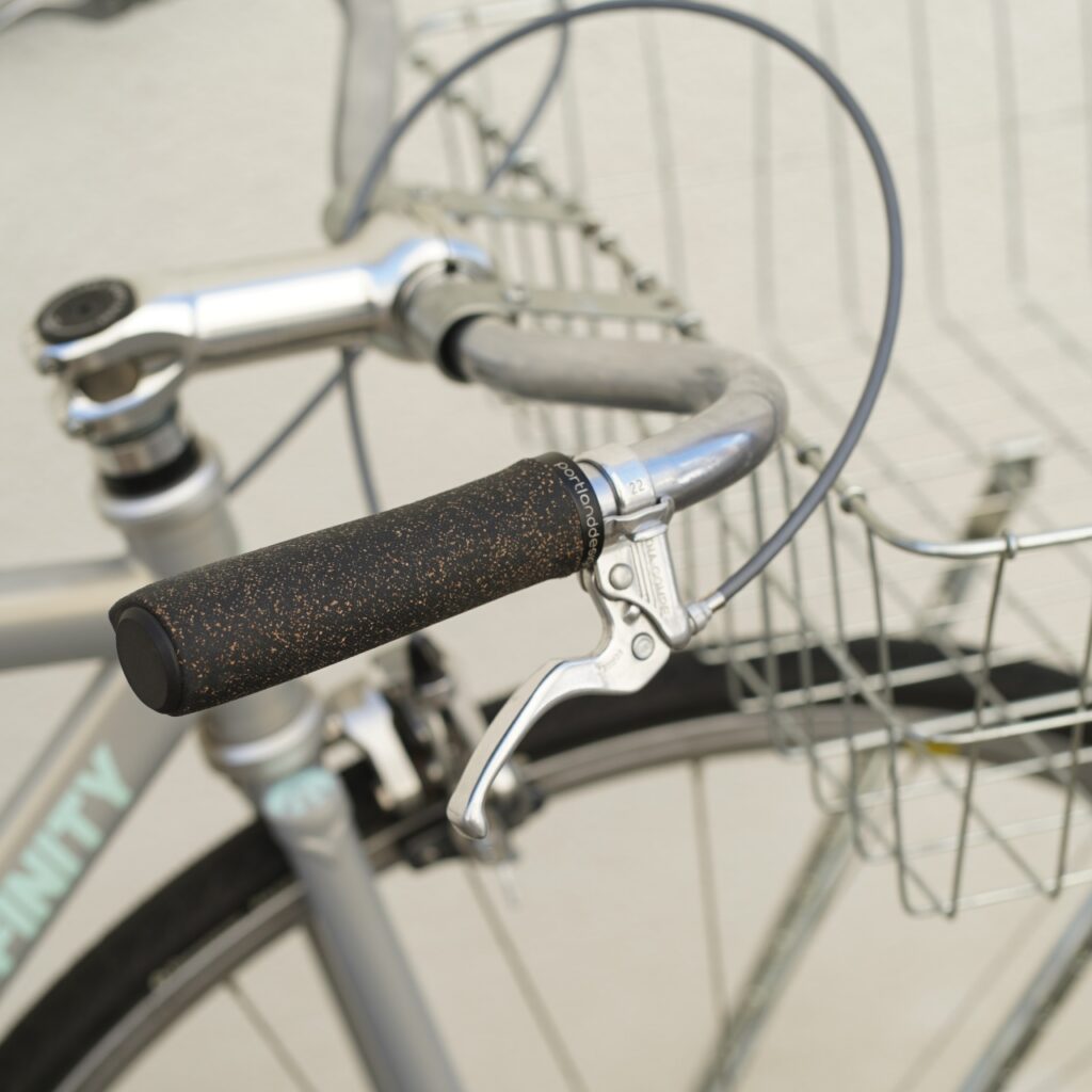 PDWのコルクチョップグリップは当店でも定番。ブレーキレバーはダイアコンペのチープなものをあえて。