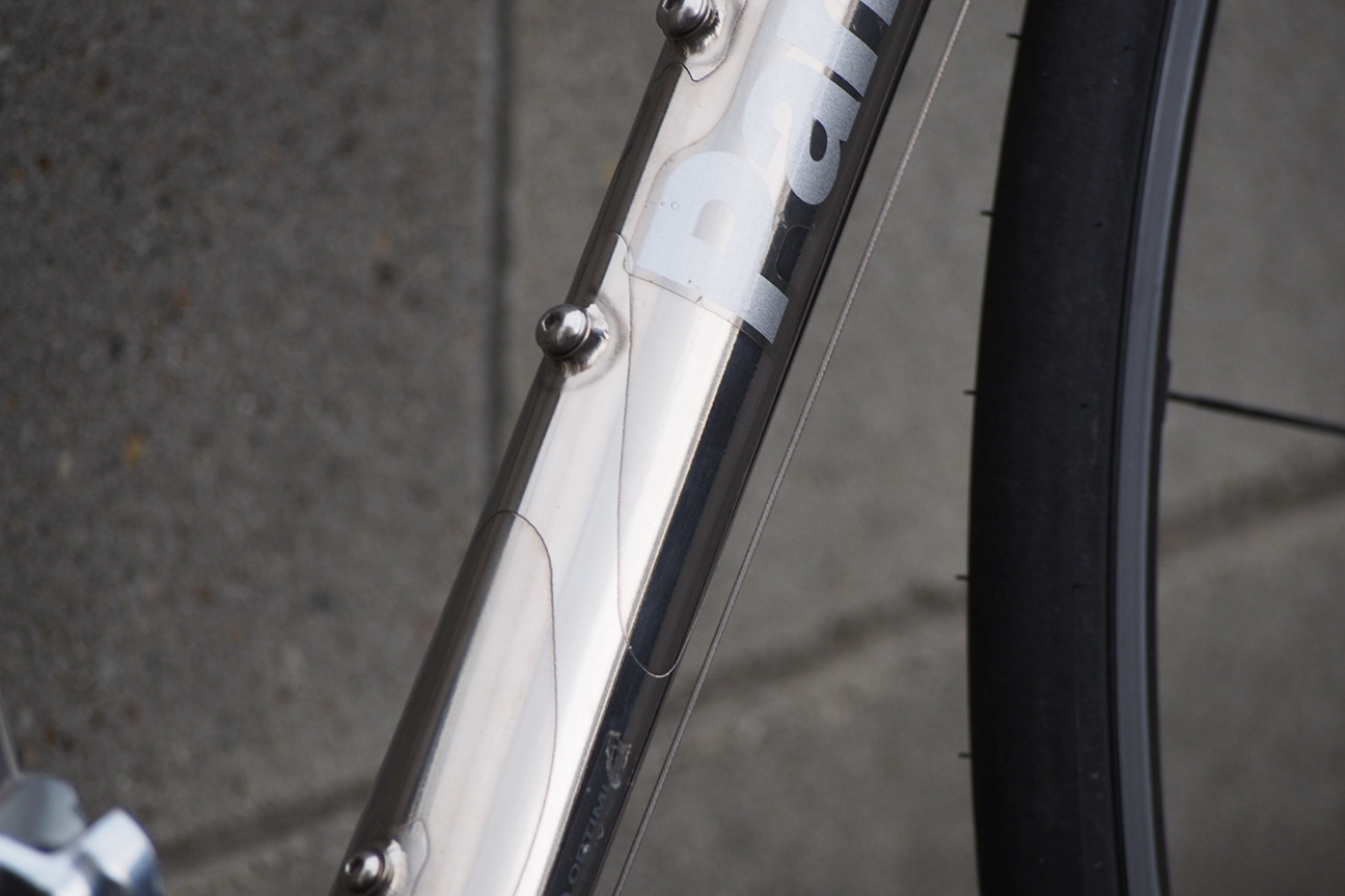 不要な部分は徹底的に削ぎ落とされており、ダウンチューブを指でつまむと少したわむ程。逆に応力のかかる部分にのみ分厚く形成するという、軽さと剛性のベストバランスを生む、非常に基調な加工です。