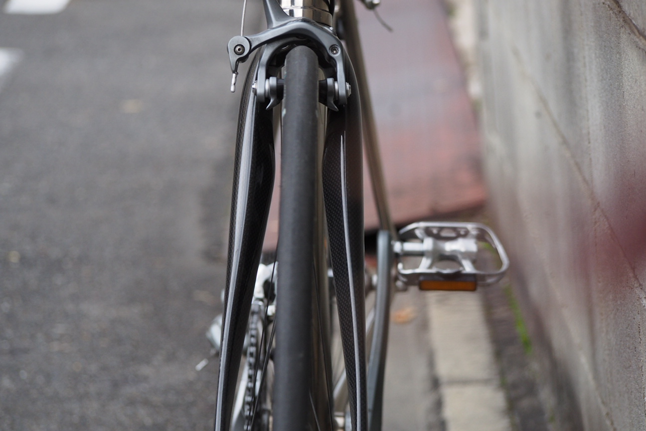 レースでの使用を想定し、”チタンフレームとの最適なマッチング”をコンセプトに開発された高剛性カーボンモノコックフォーク。人間の足に例えるとハムス トリングスにあたる中間部分を太くたくましい形状にすることで、ダンシングで力強く踏み込んだ時のたわみを抑え、鋭い加速力に変換します。また、ブレーキ ングによるたわみも抑え、ダウンヒルでの安定感を発揮。レースでの走りを第一に考えたカーボンフォークに仕上げています。