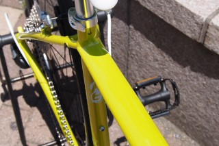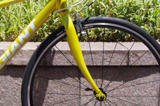 フロントフォークにはアルミではなく、乗り心地と耐久性により優れるクロモリ素材を使用しています。