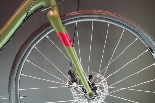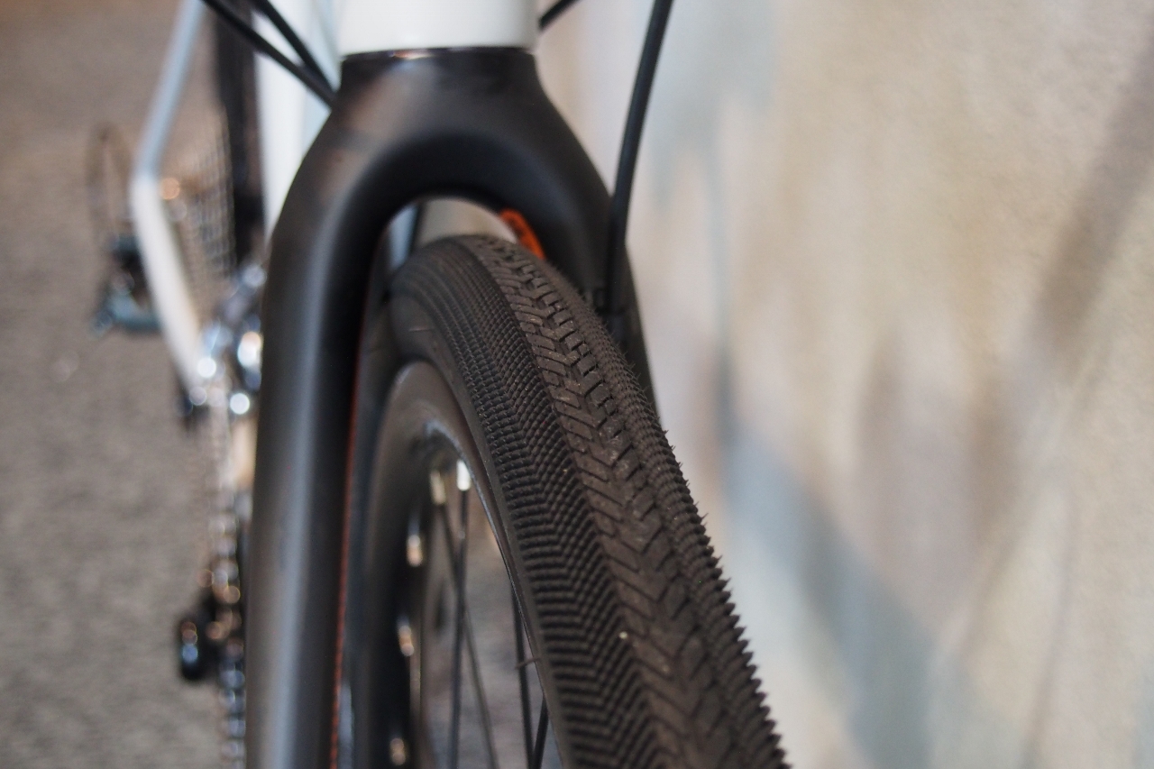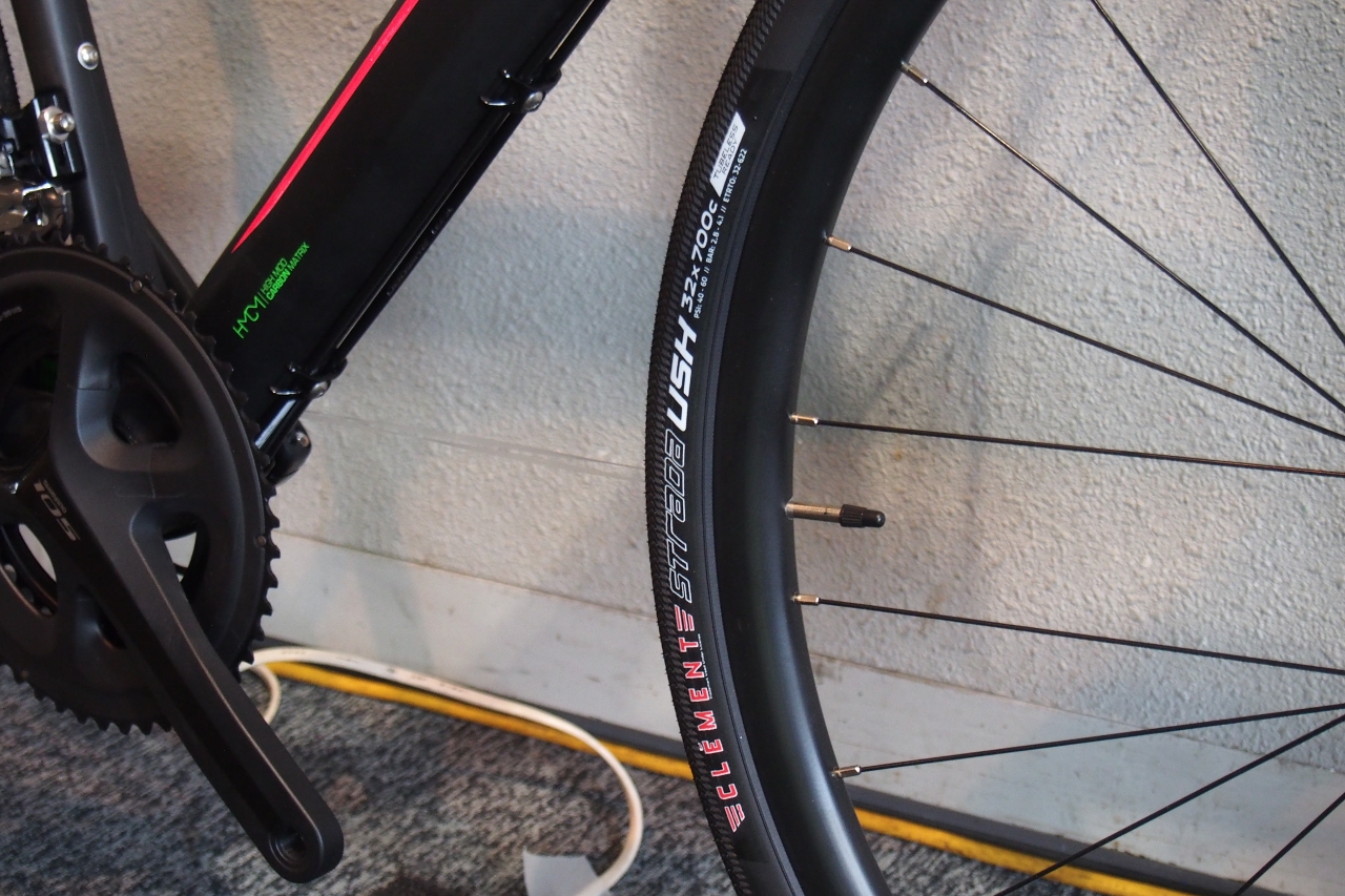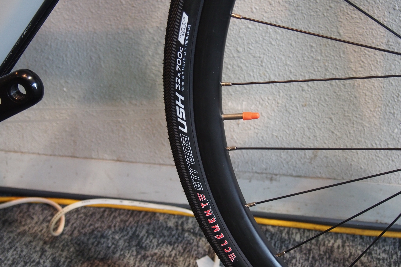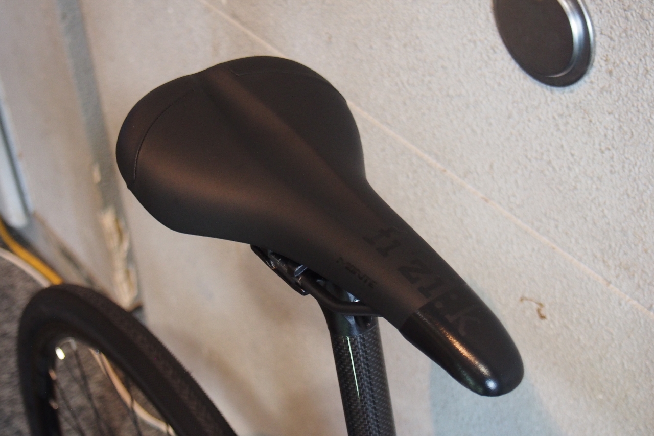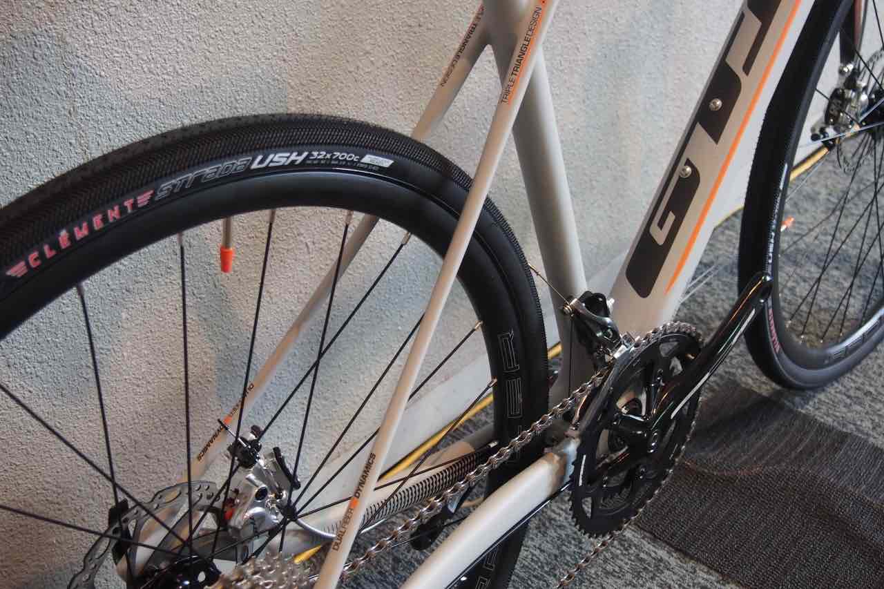 リムにNO TUBES RADLER、タイヤはCLEMENT STRADAUSH 700x32C、サドルにフィジーク MONTE MG。
