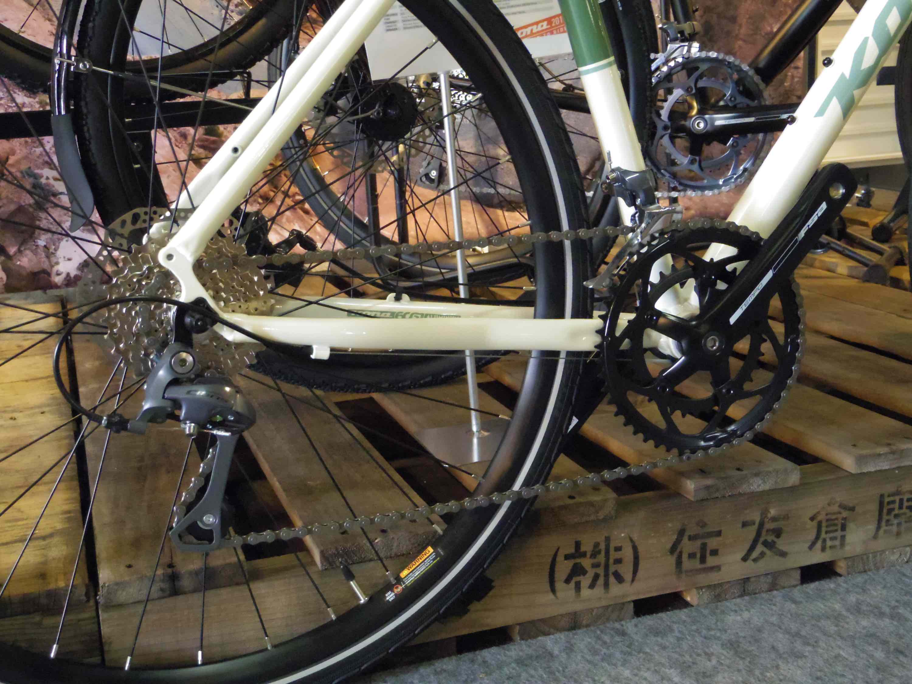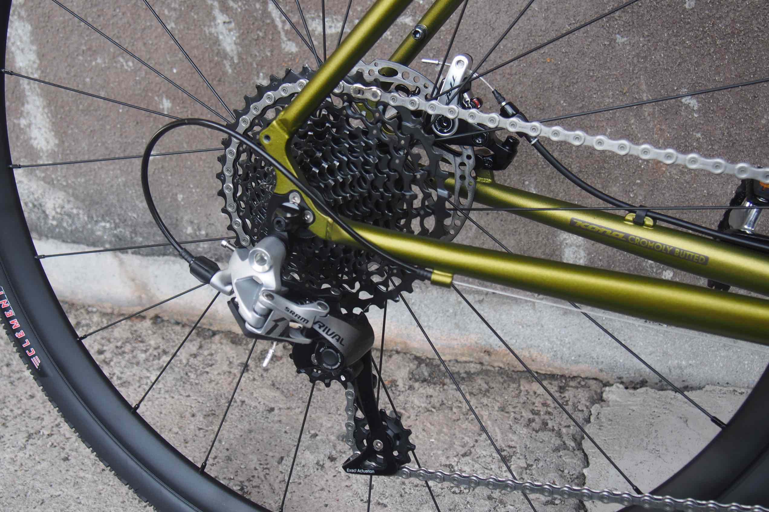 MTBタイヤが履けるワイドクリアランスでトレイルライドも楽しめてしまう、KONAらしいギミックの効いてます。