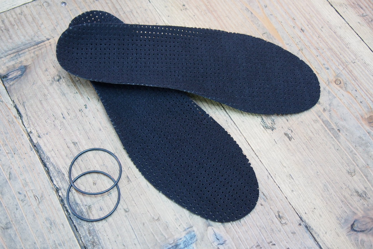 それぞれには、甲の高い方向けの薄めのインソールと、NATURAL TOE FIT、EXTRAWIDE FITに使用する(ワイヤーのかけ方で更に様々なフィットを可能とします)ゴムひもが付属されます。