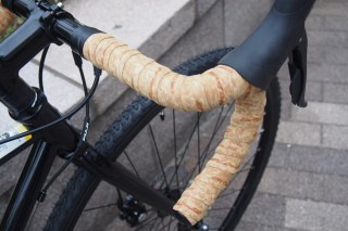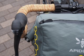 新型SORA R3000系。STIレバーが上位グレードと同様、変速ワイヤーがハンドルに沿ったかたちに。ハンドル周りがすっきりし、画像のようにフロントバッグなども取り付けがスムーズ。
