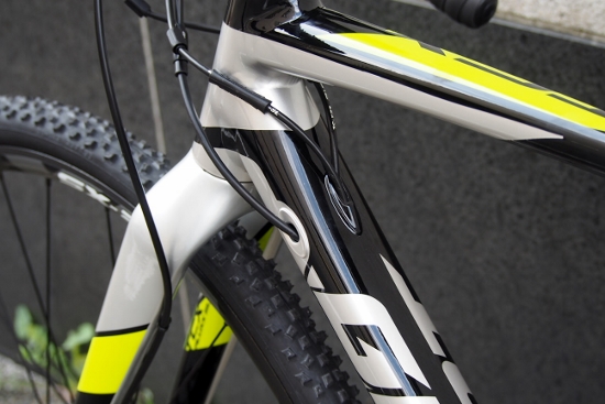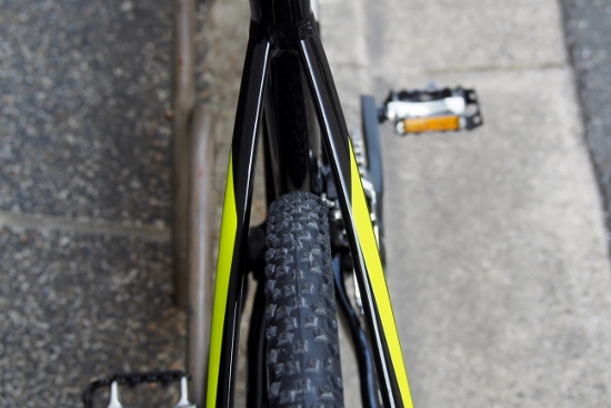 後ろに向かってグッと細く絞られたトップチューブ。