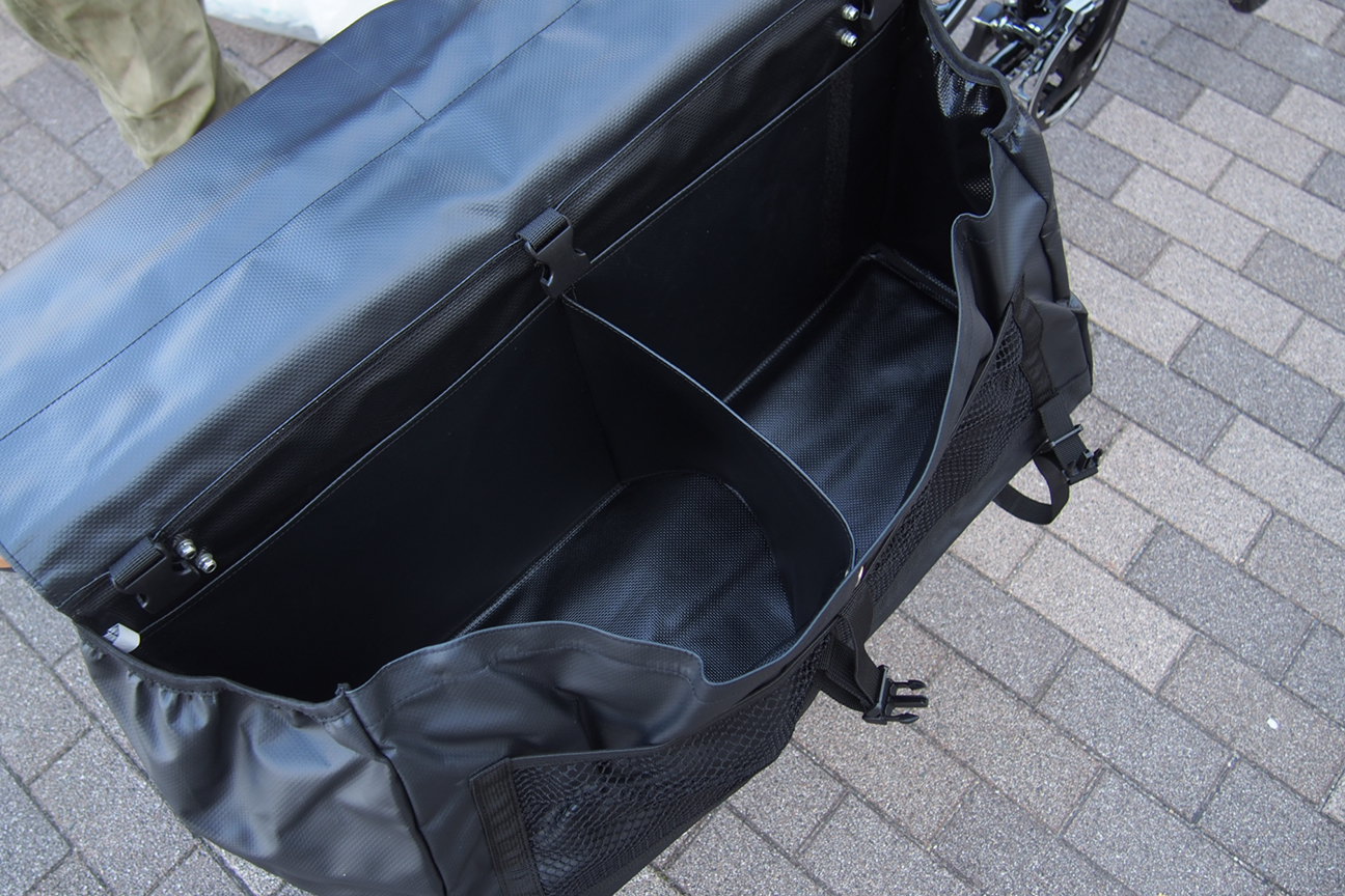 これまた嬉しい、このターポリン素材の大型パニアバッグが標準で付属されます。外フタにも二つのポケットがあり、また内側にもメッシュポケットがあります。