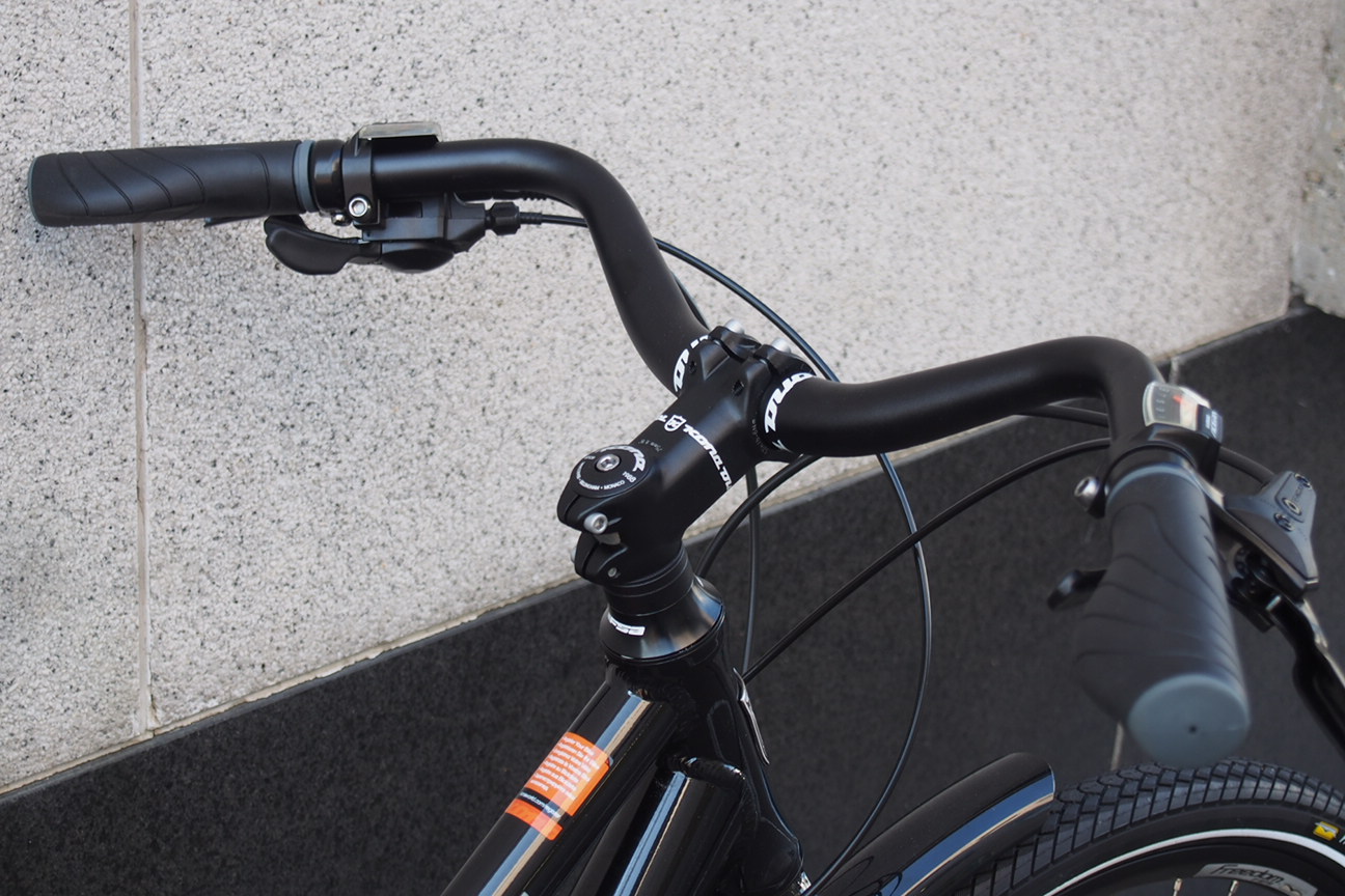 本モデルに採用されるカモメ型のハンドル。ハンドルを握る部分が手前のほうに向かってくる形状で、ママチャリのようにラクチンな乗車姿勢で乗車いただけます。スポーツ車のように深い前傾姿勢にならず視界を広く保つ事ができ、街中でも安心して乗車できます。