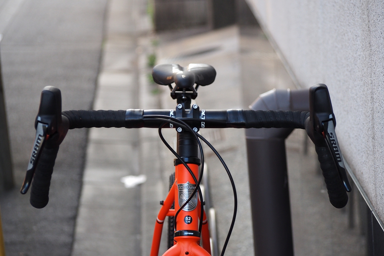 ややハの字に広がったハンドル形状は、下ハンドル部へのアプローチがしやすく車体を安定させたり、より強いレバーの握りを可能とします。