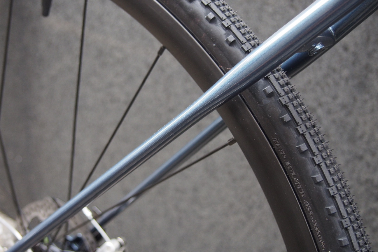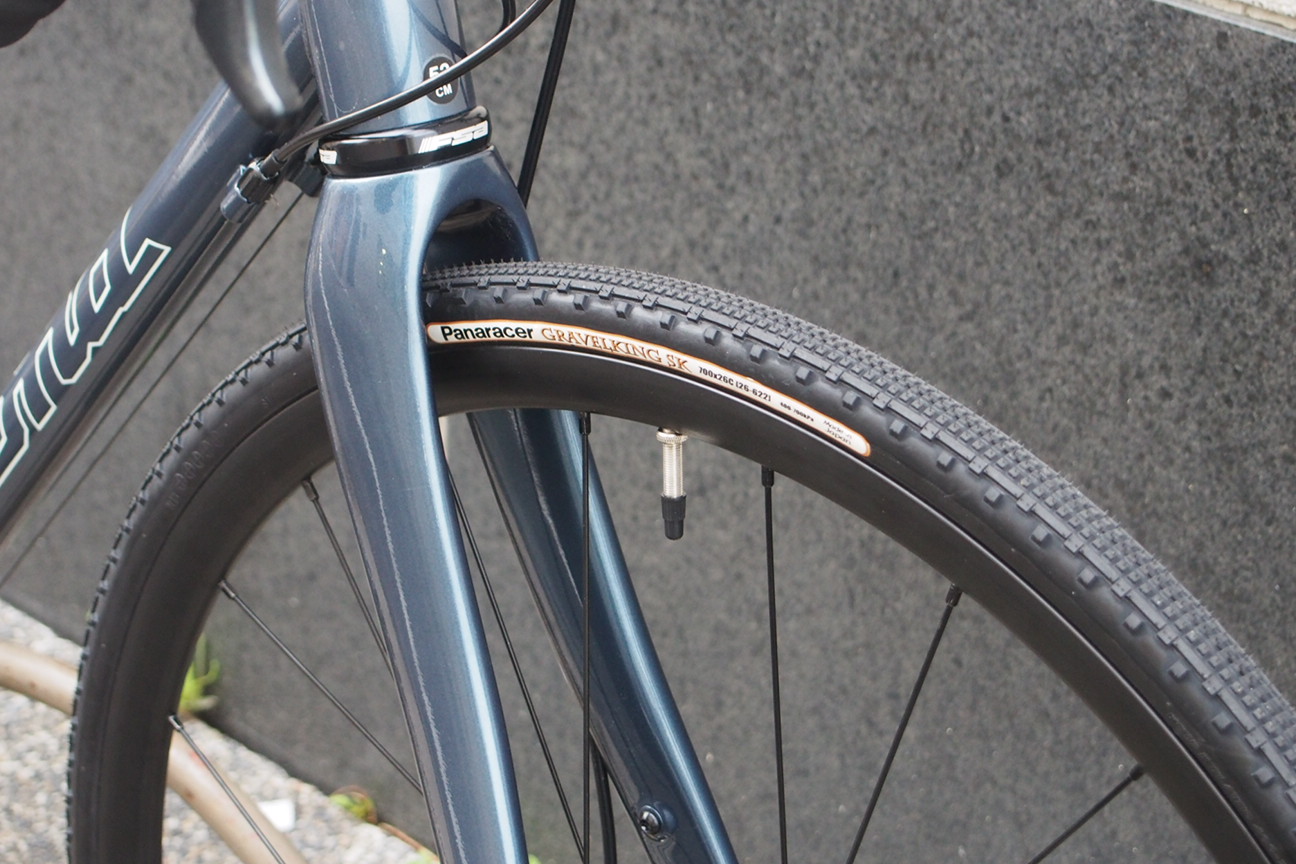 先日のブログ(詳しくはこちら)で報告させていただきました世界初でしょうか?ロードバイク用ブロックタイヤ、【PANARACER】 GRAVELKING SK(グラベルキングSK) 700x26C。本車体とのキャラクターとも相性ピッタリ。標準タイヤの30Cからやや細くなった分のクリアランスも気になりませんね!