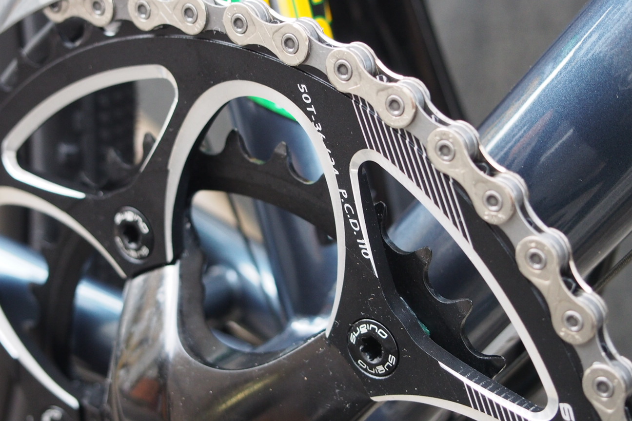 安心のSHIMANO製クランクにCNC加工されたSUGINOチェーンリング変更。