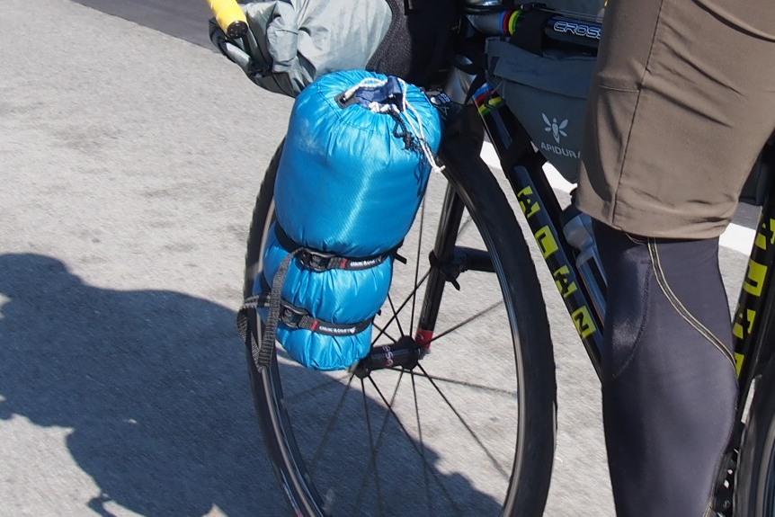 上で紹介したAPIDURAバイクパッキング以外で、追加での積載を必要としたのがコチラ。寝具の基本、シュラフ(寝袋)です。コレがないとこの時期の野営はありえません。