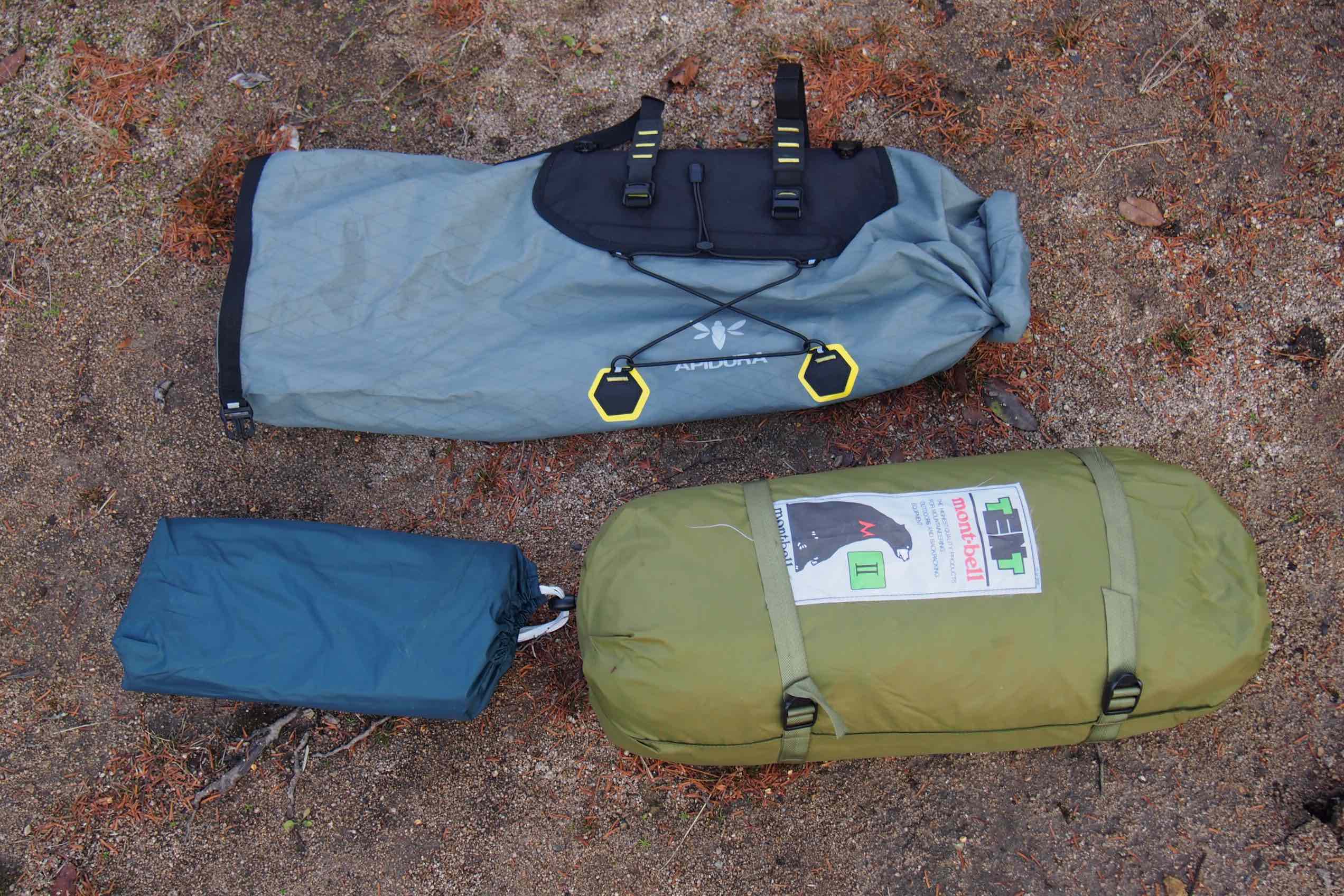 モンベルのムーンライト2型と専用グラウンドシートのみとなっております。APIDURAハンドルバーバッグ(レギュラー)との相性は調度ピッタリ。