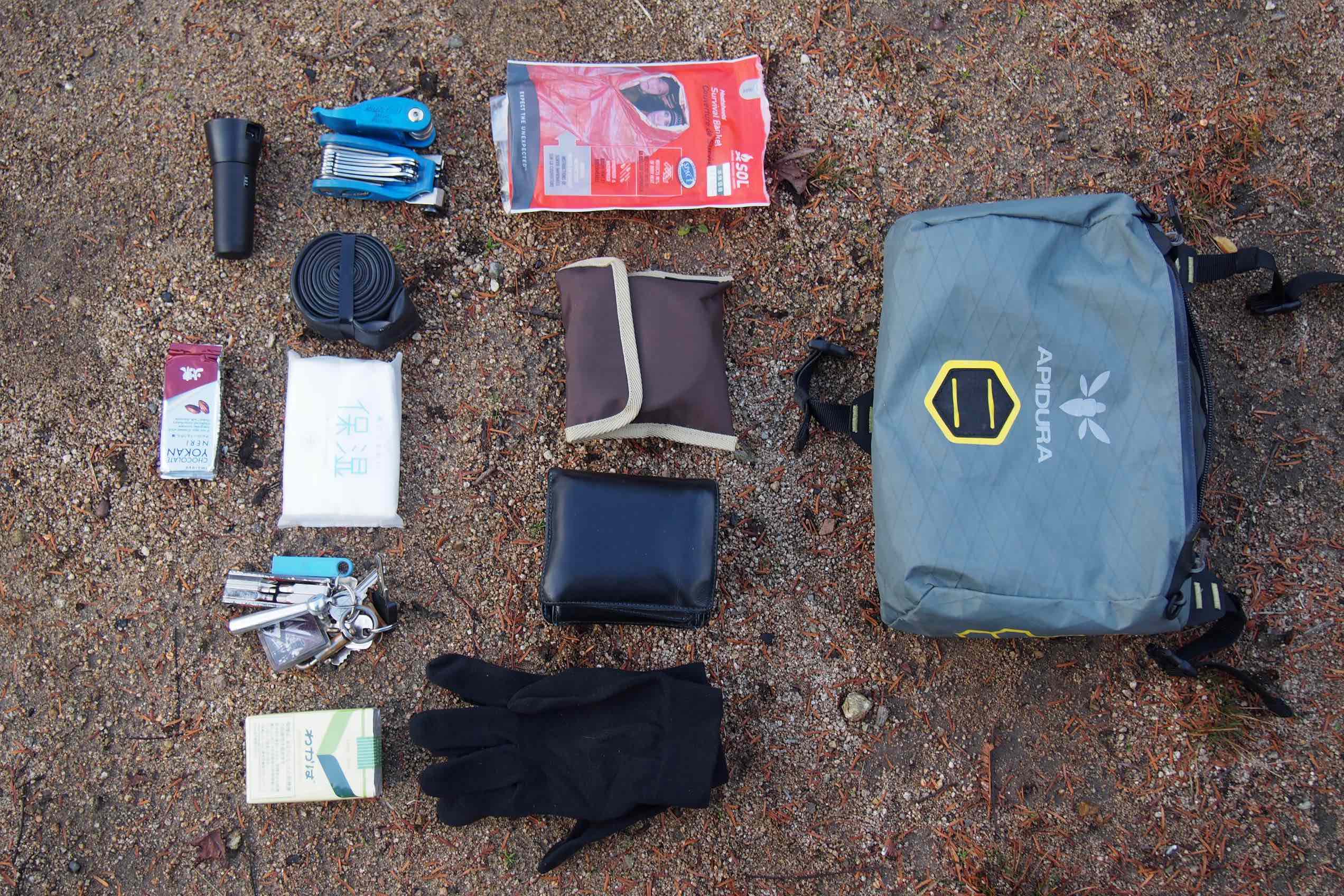 ●右上:エマージェンシーシート ●右二段目:コーヒードリッパー ●右二段目:財布 ●右下:インナーグローブ