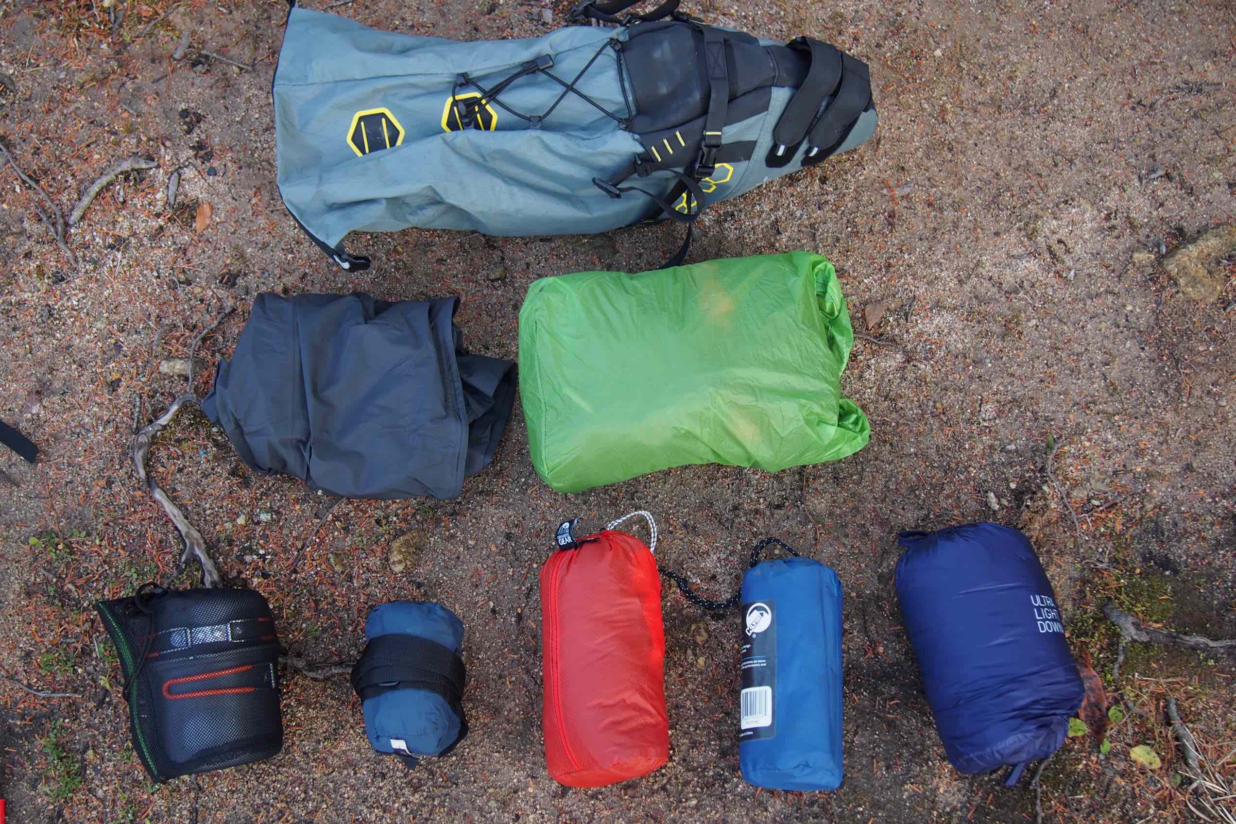 ●下段左端:クッカー/バーナー ●下段左から二つ目:輪行バッグ ●下段中央:軽量ダウンジャケット#1 ●下段右から二つ目:フロアマット ●下段右端:軽量ダウンジャケット#2