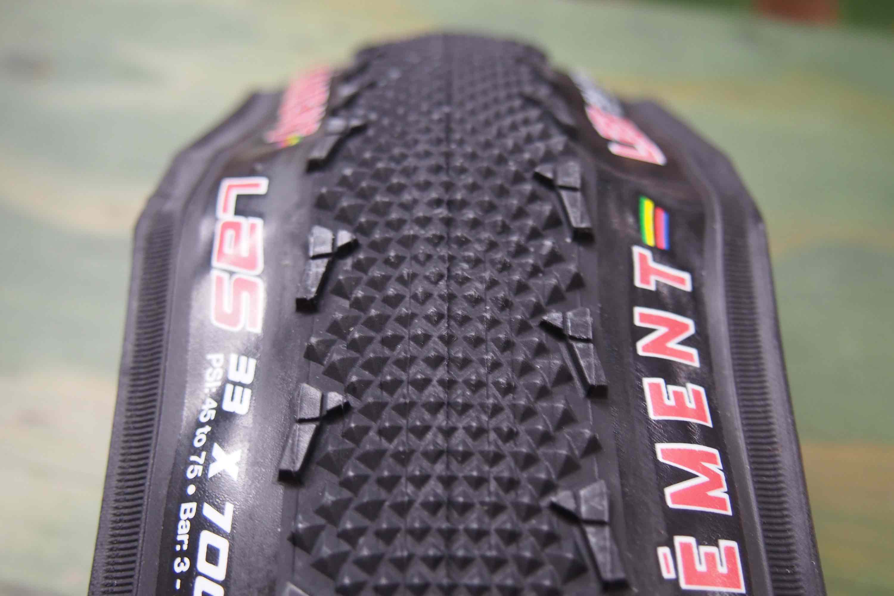 このタイヤの特徴とも言えるのがこのトレッドパターン。センターとサイドで2種類のノブを使い分ける事で走行時の転がりを軽く、それでいてコーナリングの際にはしっかりグリップしてくれます。