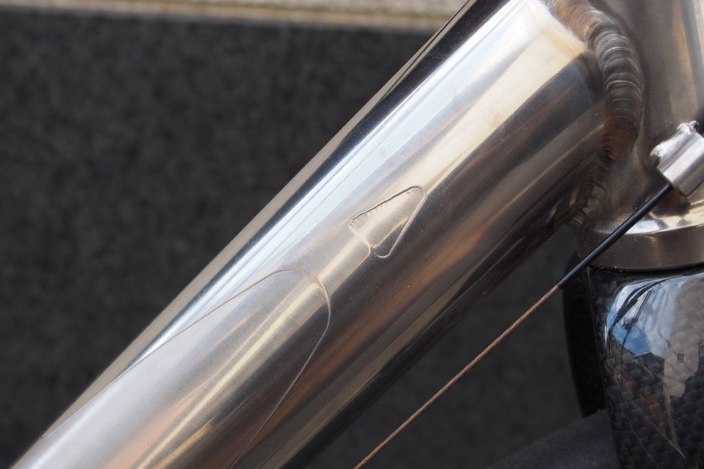 乗車時に伴うフレームにかかる応力を解析FEMを行う事で、各パイプへの応力が集中する部分にX型の凹凸をつける事で、チタン独特のしなやかな乗り味をベースに剛性の向上とフレームの軽量化を最大限に両立しております。
