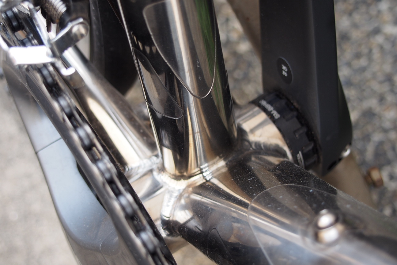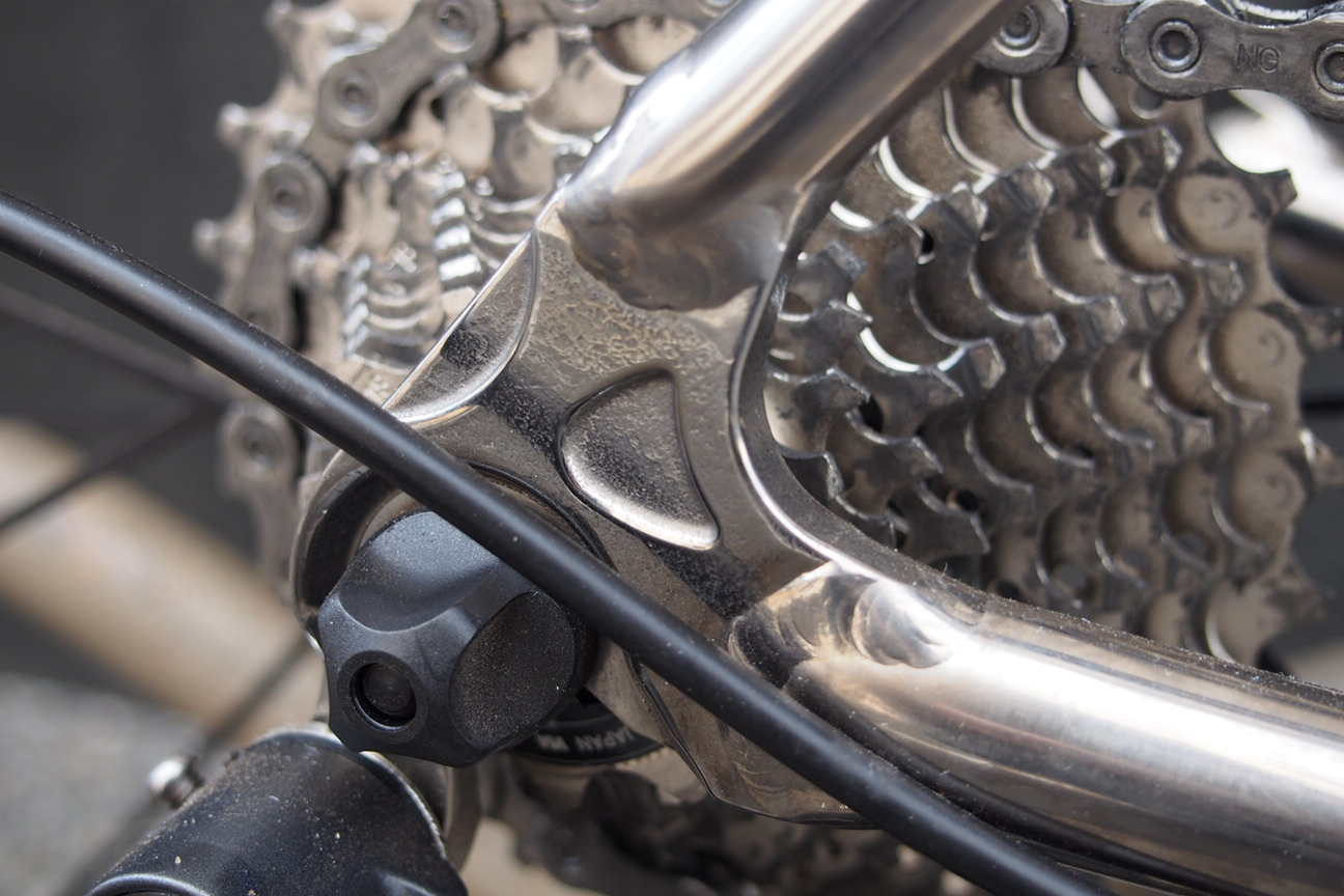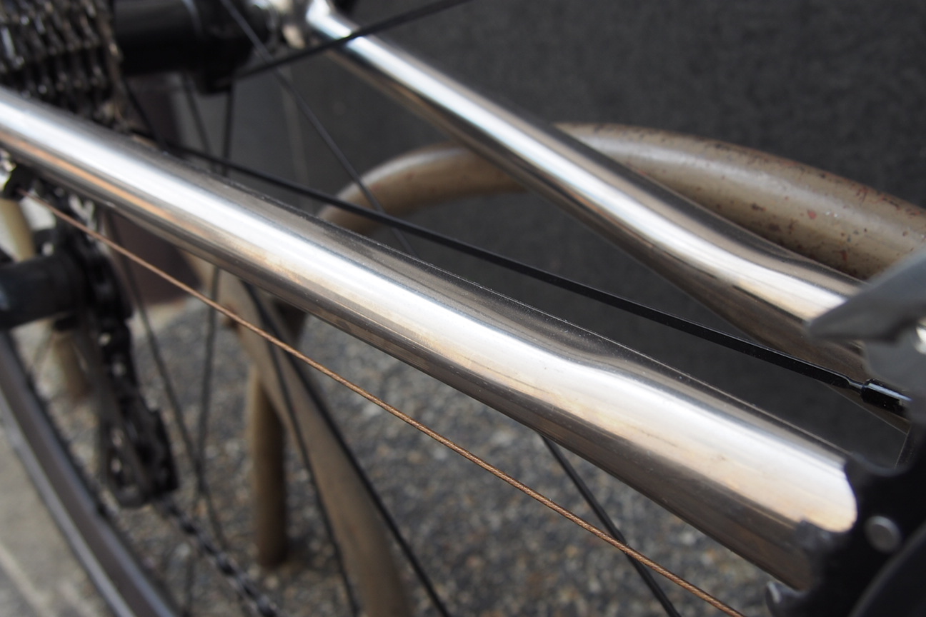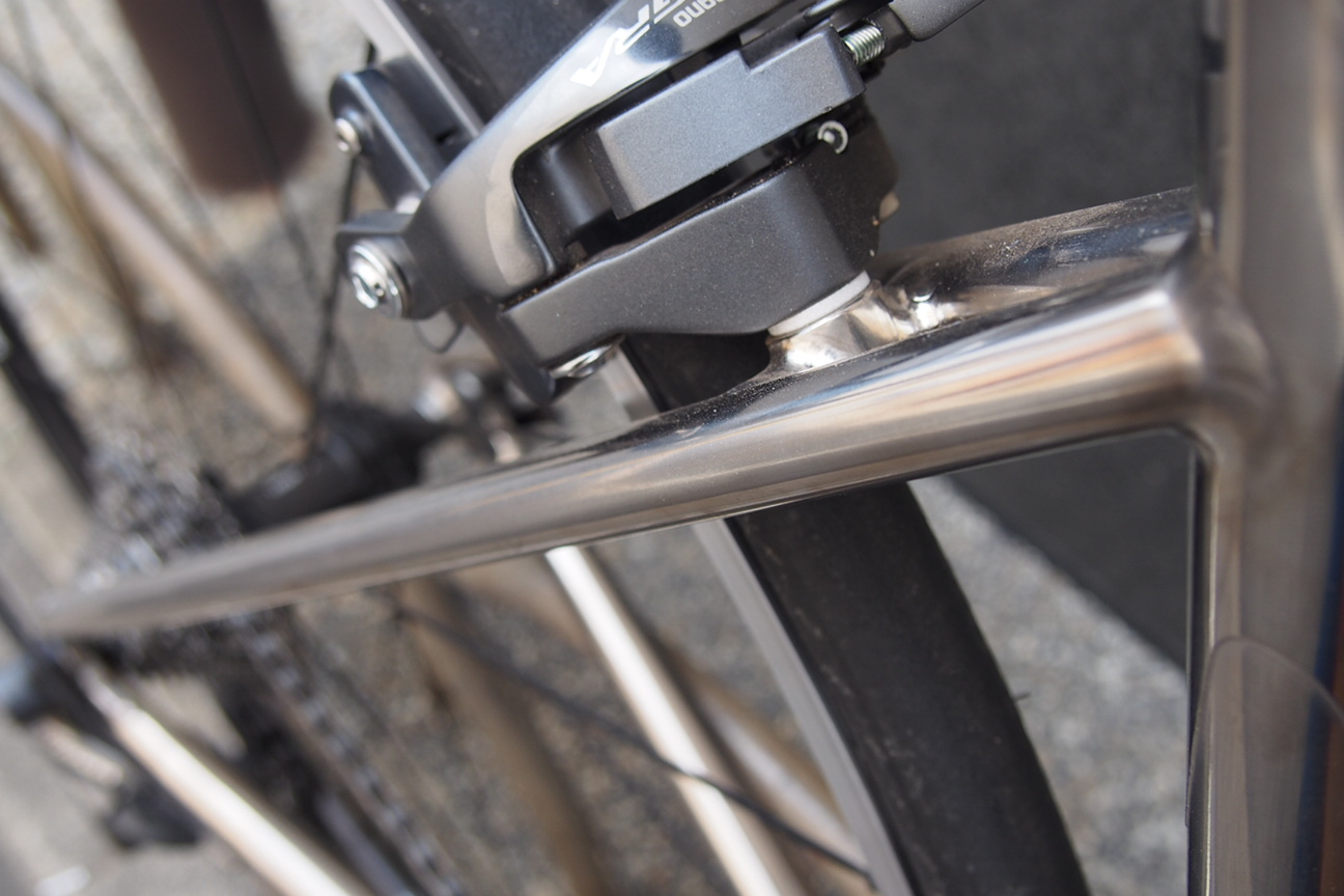 パナチタン、メインフレームには、比強度・伸び・弾性のバランスが取れた「3AL-2.5V TI合金チューブ」を採用。そのさびに強い耐腐食性はご存知の方も多いと思いますが、ペダルを踏み込んだ際にフレーム自体がエネルギーを溜め、そのパワーをゴム毬が弾むように一気に 加速していく心地よさは本当に気持ちよく、チタンフレームの最大の特徴ともいえましょう。そしてそのチタン独特のしなりに加え振動吸収性も非常に高く疲労を軽減する面においては申し分なく、もはやロングライド(ブルぺ)にはこのしなやかな乗り味はもはや最適な素材かといえましょう。またリアエンド部にはメインフレームとは違い、非常に強固なロストワックス「4AL-6V TI合金」を採用し、ハンガー曲がりやねじれを抑制しスムーズな動力伝達を可能としております。