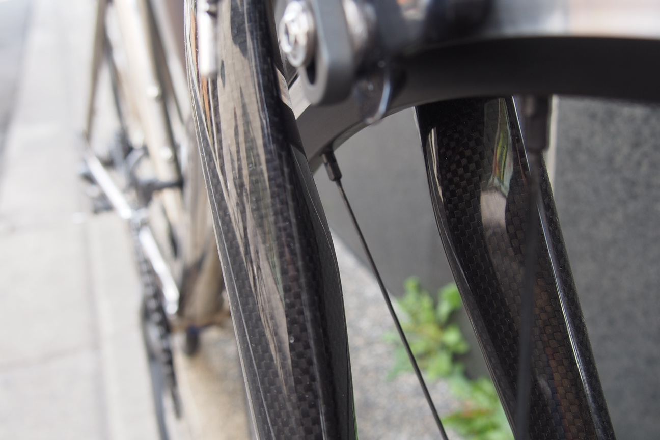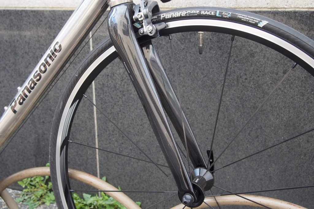 中々に評価されることが少なくありますが、個人的には大好きなこのフロントフォーク。フォーク中腹部を内側に太くたくましい膨らみのある形状にし、ダンシング時におけるたわみを抑制し、推進力に効率よくそのパワーを変換します。またパナソニックがもつSBAAという安全基準をクリアしたその剛性面も非常に高くダウンヒル時の安定感を発揮し、非常にスムーズな高速でのコーナリングも可能。