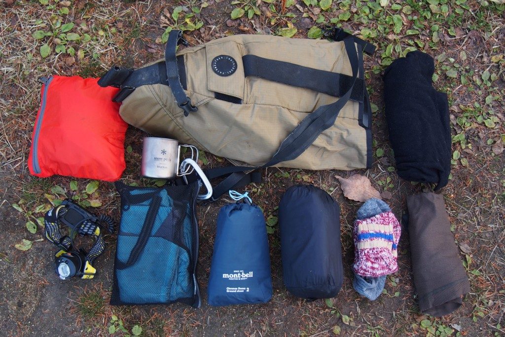 ●下段(左から):ヘッドライト、輪行バッグ、グラウンドシート、ダウンジャケット(薄手)、ソックス、インナーウェア
