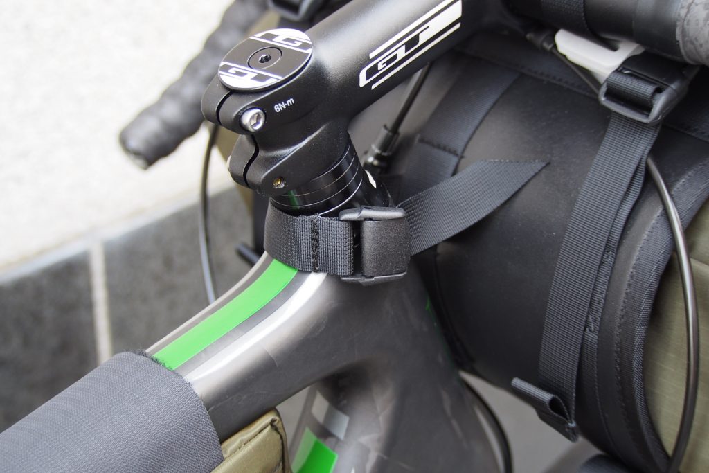 ヘッドチューブorコラム部にもストラップで固定しユサユサを防ぎます。