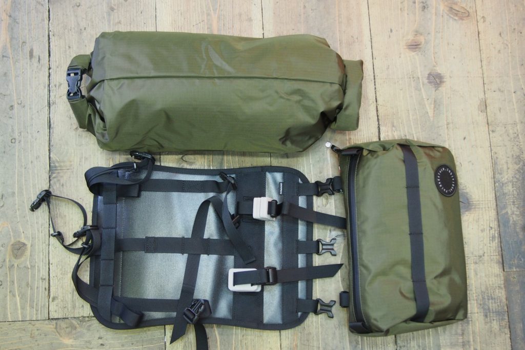メインロールバッグ、ハーネス、アクセサリーバッグの3点で構成されておりバラすとこんな感じに。