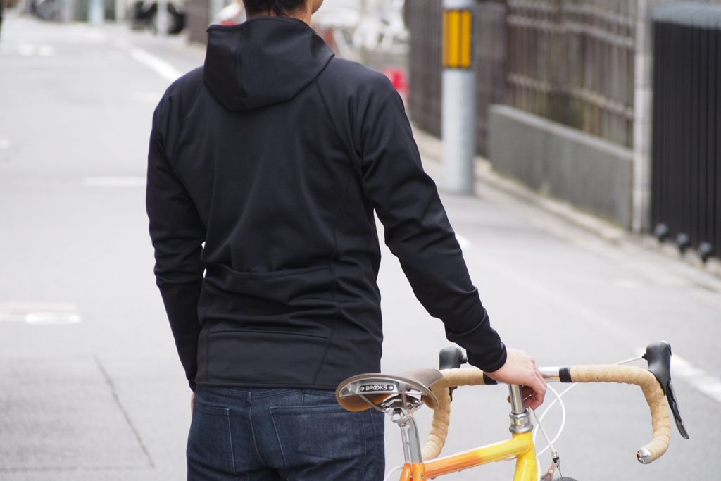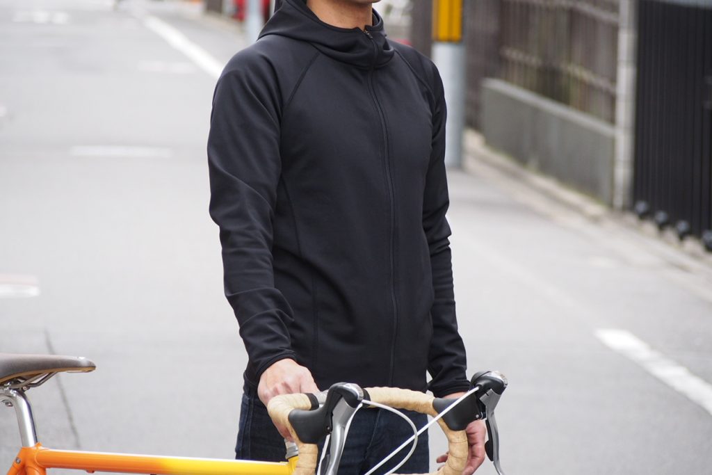 タイト目のフードは自転車乗車時の後方確認もしやすく安全面としてもGOOD!