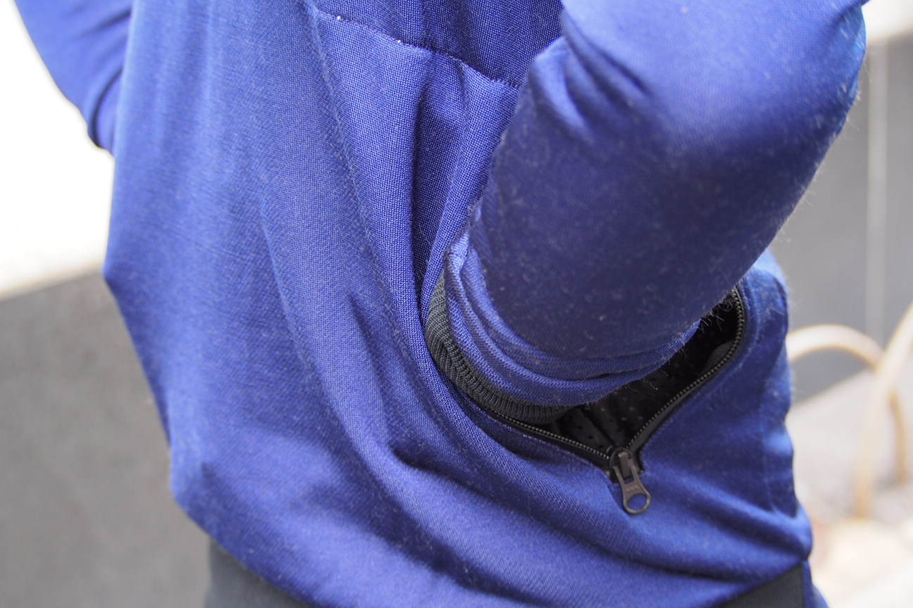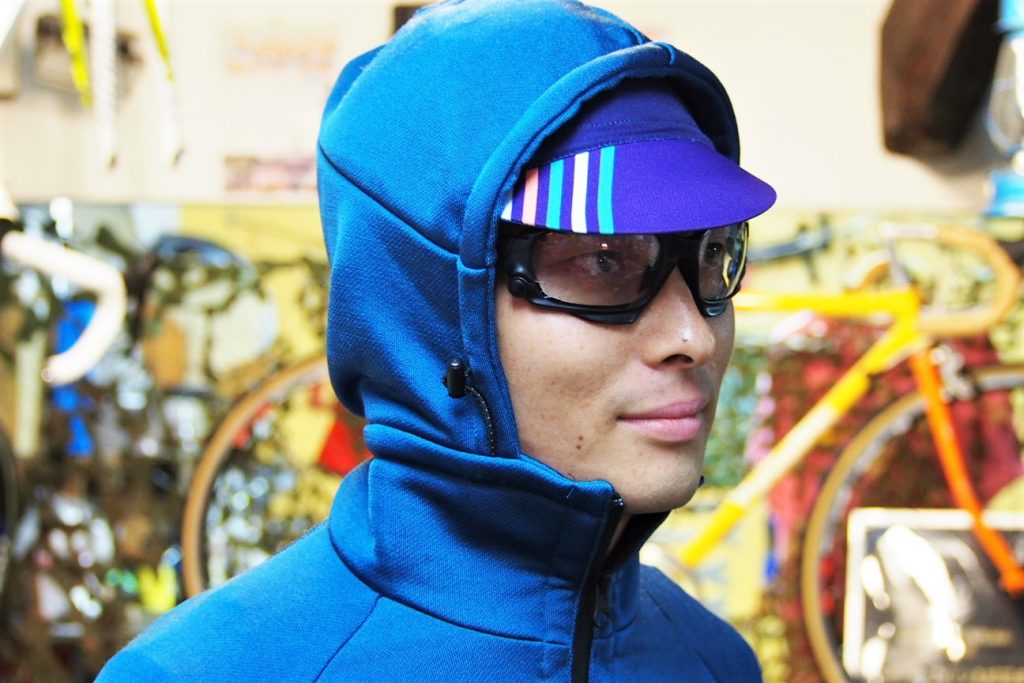 またライディング時の空気抵抗を意識したスキニーなシルエットに加え、フードは邪魔にならない様に小さくまとめ、さらにフード口をアジャスターで絞れるようになっています。