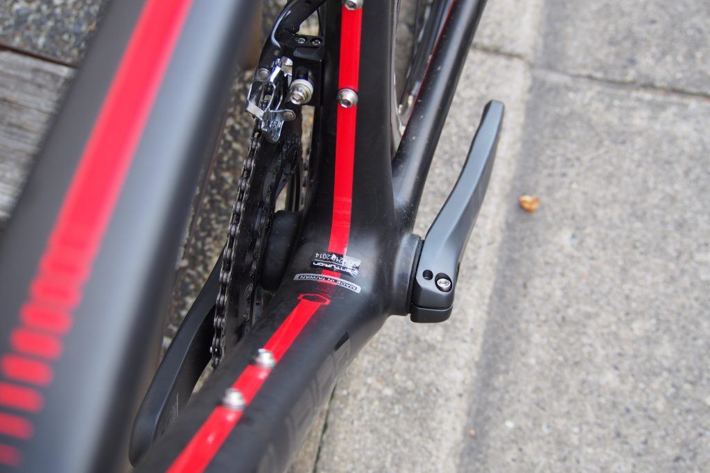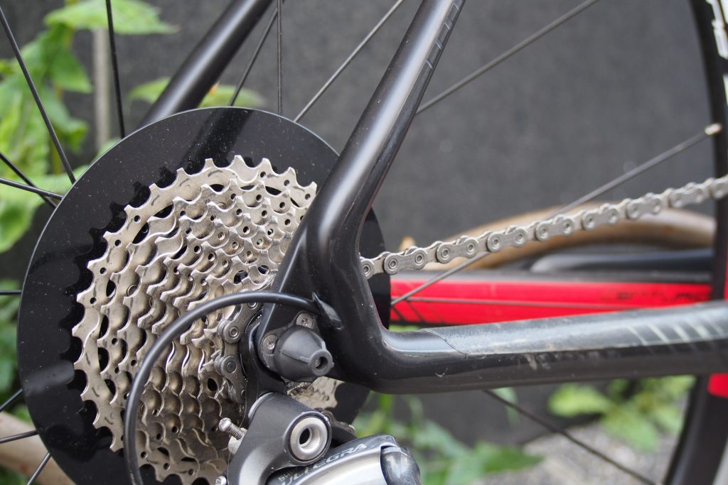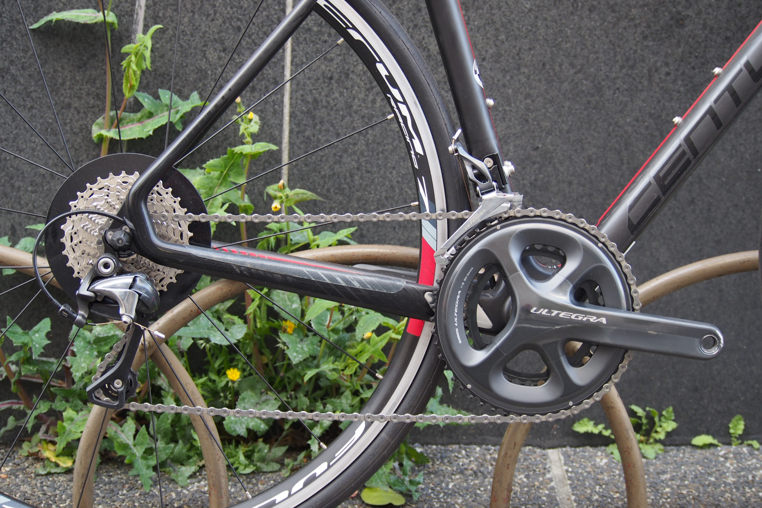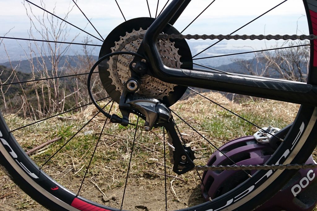 フルカーボンロードには珍しいミドルゲージリアディレーラーを採用した11-32Tのワイドなギヤレシオ。