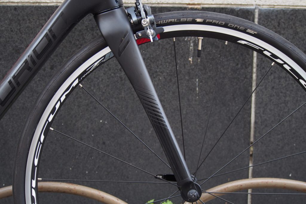 重量はそこそこですが、ストレートプルスポークにリアは2:1スポーク採用で非常にカッチリ感があるのでカーボンフレームの軽快な加速感を堪能できますよ◎