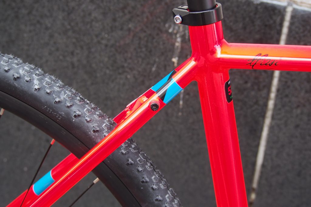 変速ケーブル、リアブレーキケーブルはフルアウターのダウンチューブ内蔵。ケーブル内への水の侵入を防ぐ効果は勿論のこと、トップチューブにケーブル類が通らずシクロクロスレースやグラベルツーリングの担ぎでも邪魔になりませんね!