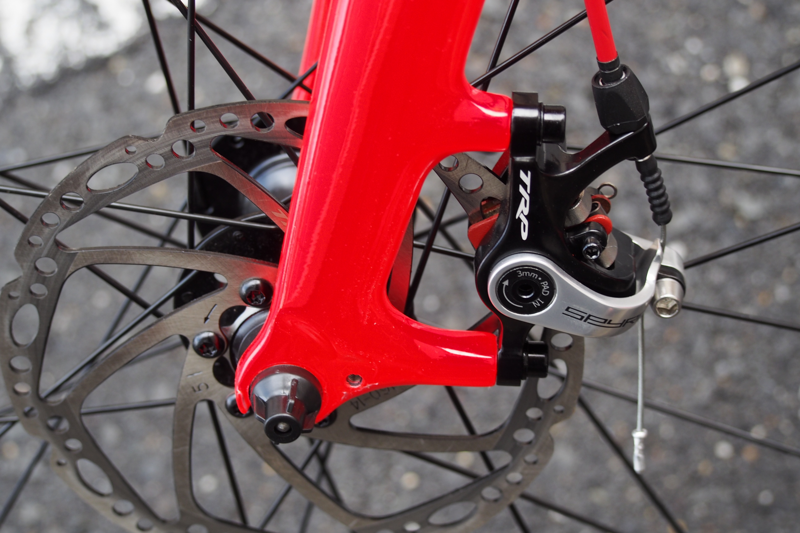 ブレーキにはお馴染みの左右のアームでローターを挟み込みブレーキングするTRP SPYREが採用。