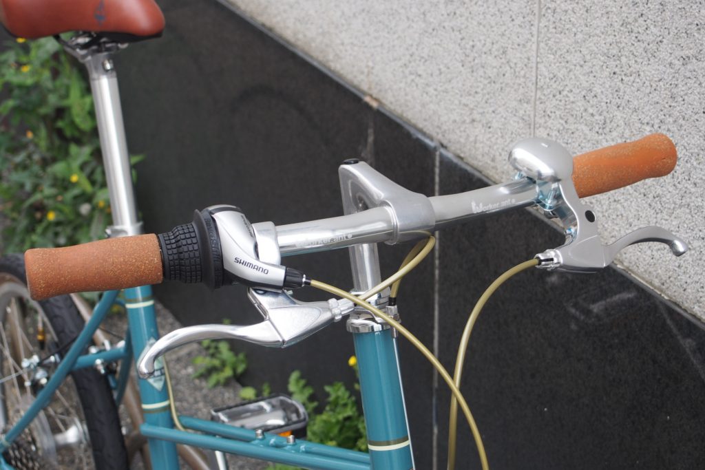 ハンドルも一直線の棒ハンドルでは無くゆるーく手前に曲がった使いやすいものをチョイス。一直線だと前かがみになるし、曲がりすぎると少し窮屈になるしという不安を無くしてくれる街乗りに丁度良い仕上がりに。