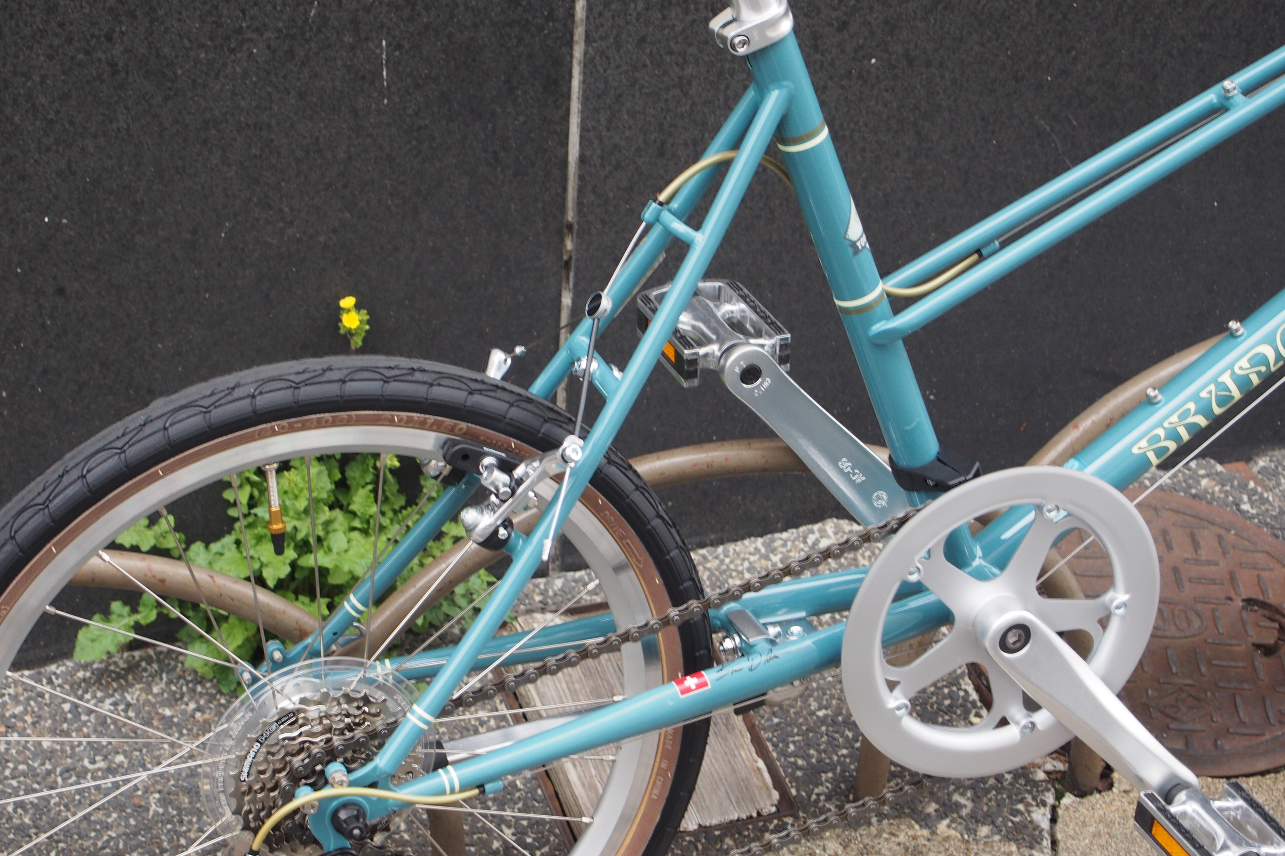 一般的なママチャリや他のスポーツバイクと比べてタイヤ系が小さいミニベロ。小回りが利き、保管場所にも困らないというメリットがありますが何の工夫もないと走りの面ではデメリットが目立ってしまいます。大多数のミニベロはフロントのギアを大きくし、リアを変速付きにすることでそこを補っています。BRUNOはそこに更に一工夫!大きなギア・変速は勿論のこと後ろのホイールまでの距離を長めにとる事で高い安定感を獲得。ミキストによる低重心と相まって走り出しは軽く、スピードに乗ると減速し難くなっています。