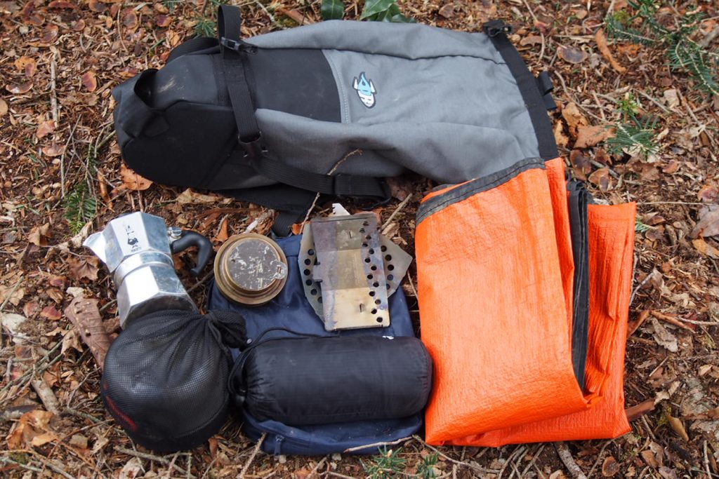 バーナー・コッヘル・コーヒーメーカーなどの食事系グッズとタープ・輪行袋をバランスよく収納、底に布ものを詰めバッグの形を良くし、重いものから内側に詰めていくことでサドルバッグ特有の左右の振れを抑えています。