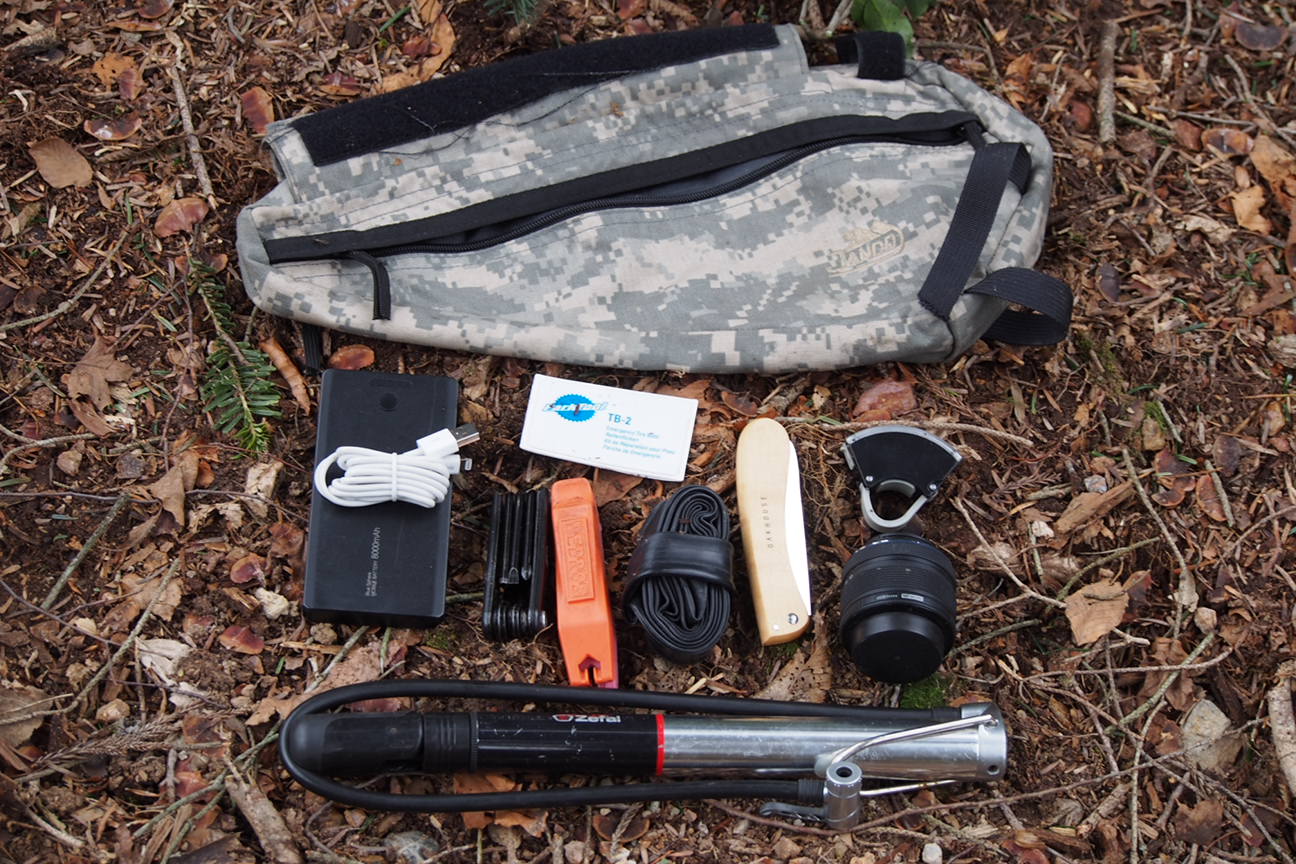 モバイルバッテリー・財布等を薄いポケットに、大き目ポケットにはポンプ・工具等のメンテナンス用具とカメラのレンズ、夜間用のライトを収納。