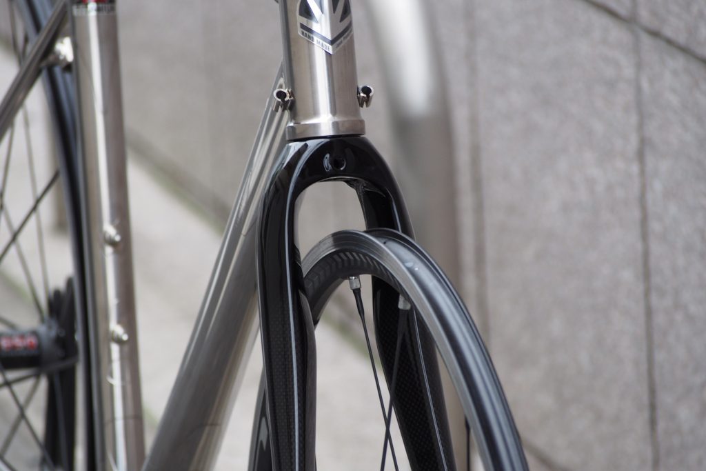 実戦での使用を想定し、”チタンフレームとの最適なマッチング”をコンセプトに開発されたオリジナルの高剛性カーボンモノコックフォーク。