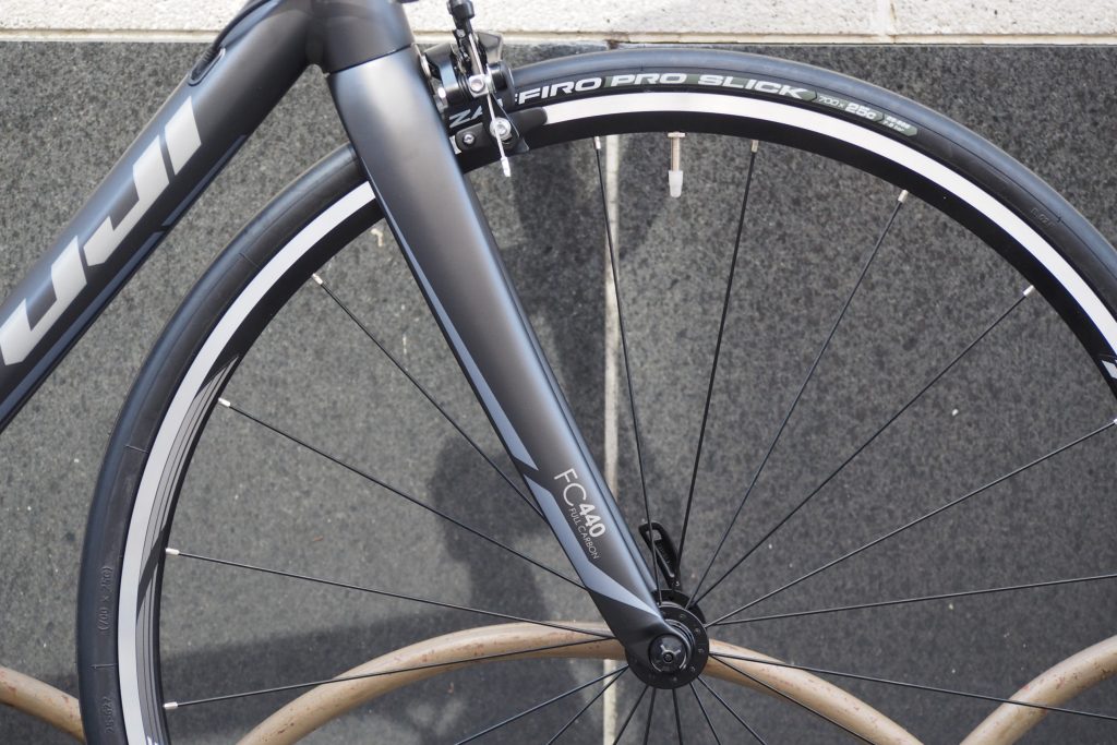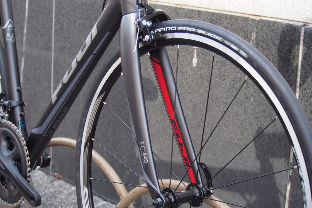 フロントフォークにはこのクラスには珍しいフルカーボンフォークを採用。