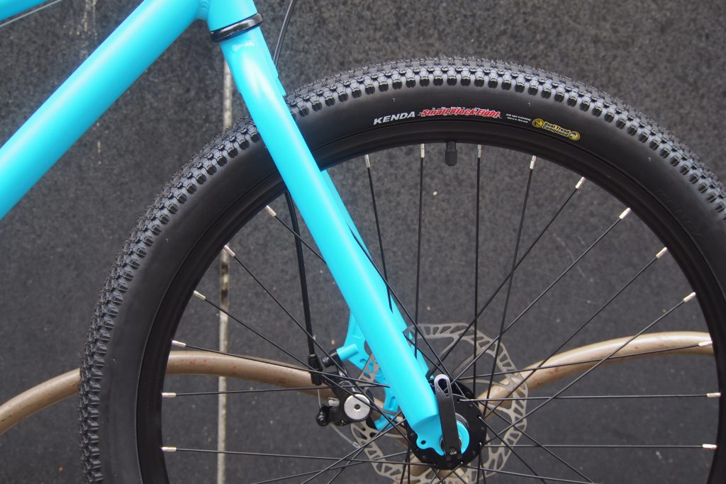 タイヤはKENDAのスモールブロック。凸凹が低いパターンのタイヤでアスファルトにおける転がりも軽く、2.1インチ幅のタイヤで少々の段差乗り越えもへっちゃらですね!もちろん耐スリップ/耐パンク性もGOOD!