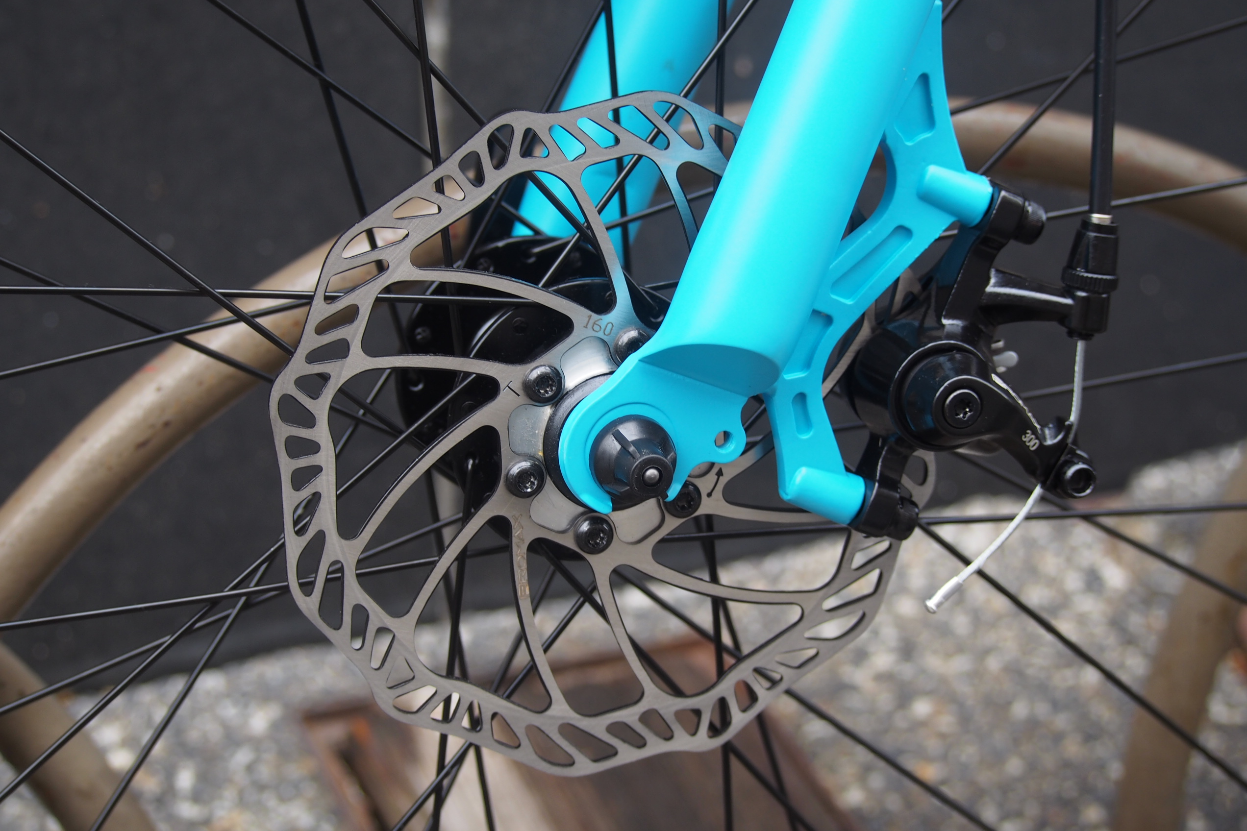 普通のリムブレーキに比べ、悪天候でも制動力が落ちにくいディスクブレーキが採用されております。