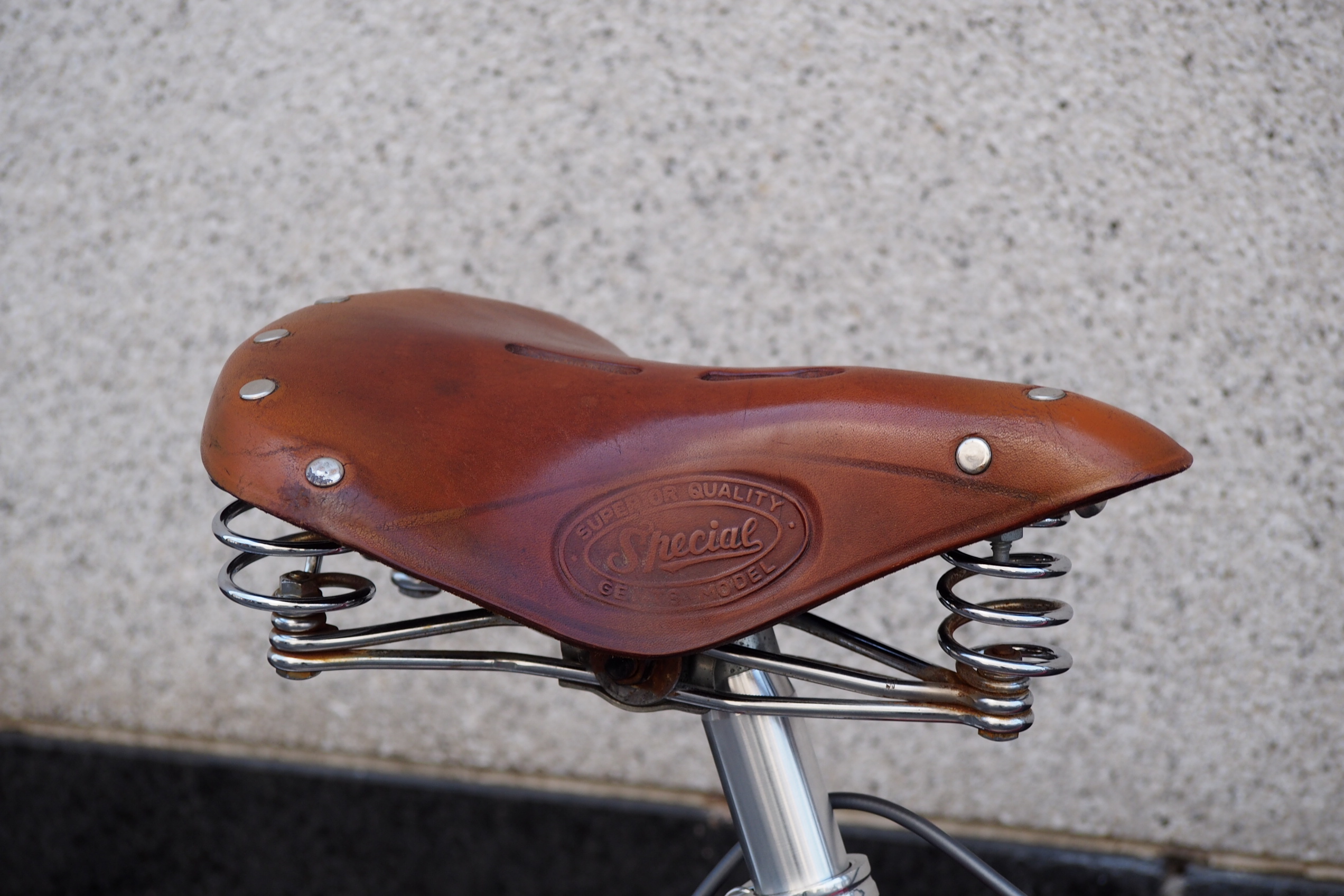 サドルはお客様の持ち込みでレザーサドルに。結構な年代物ですがしっかり手入れされているようなのでまだまだ現役。クロモリフレームのランドナーにレザーサドルの組み合わせは見た目に美しく、なじみの出た革による乗る人にピッタリ合ったフィット感は普通のサドルでは得にくいモノがあります。