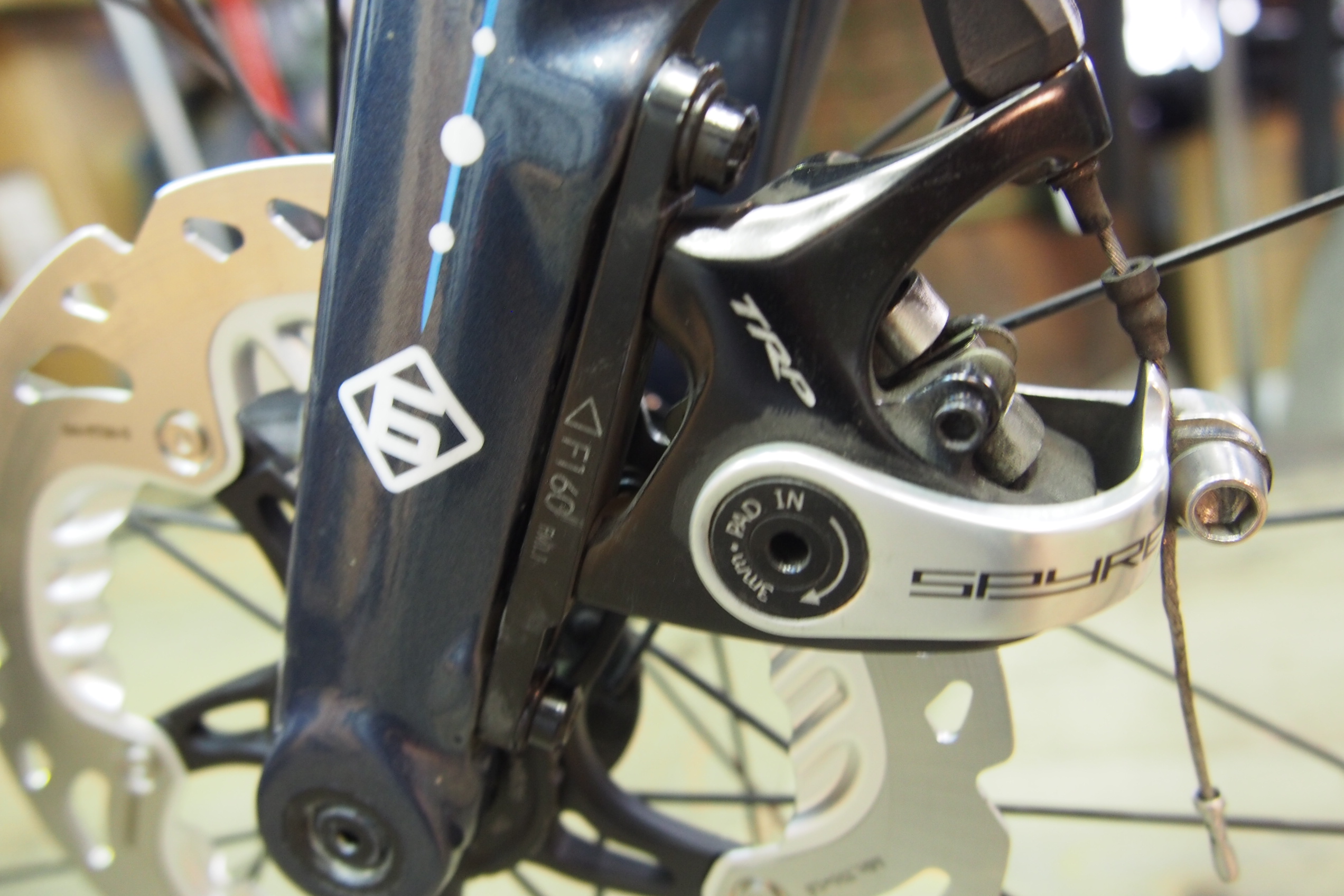 ローターがサイズアップしたことでブレーキ本体もちょっといじります。純正では140mmローターを採用していたWHEELHOUSE、フラットマウントタイプのTRP SPYREなのでアダプターの上下を入れ替えるだけで140mm↔160mmの変換OK!追加のパーツも要らず作業的にもスムーズでありがたい限りでした。