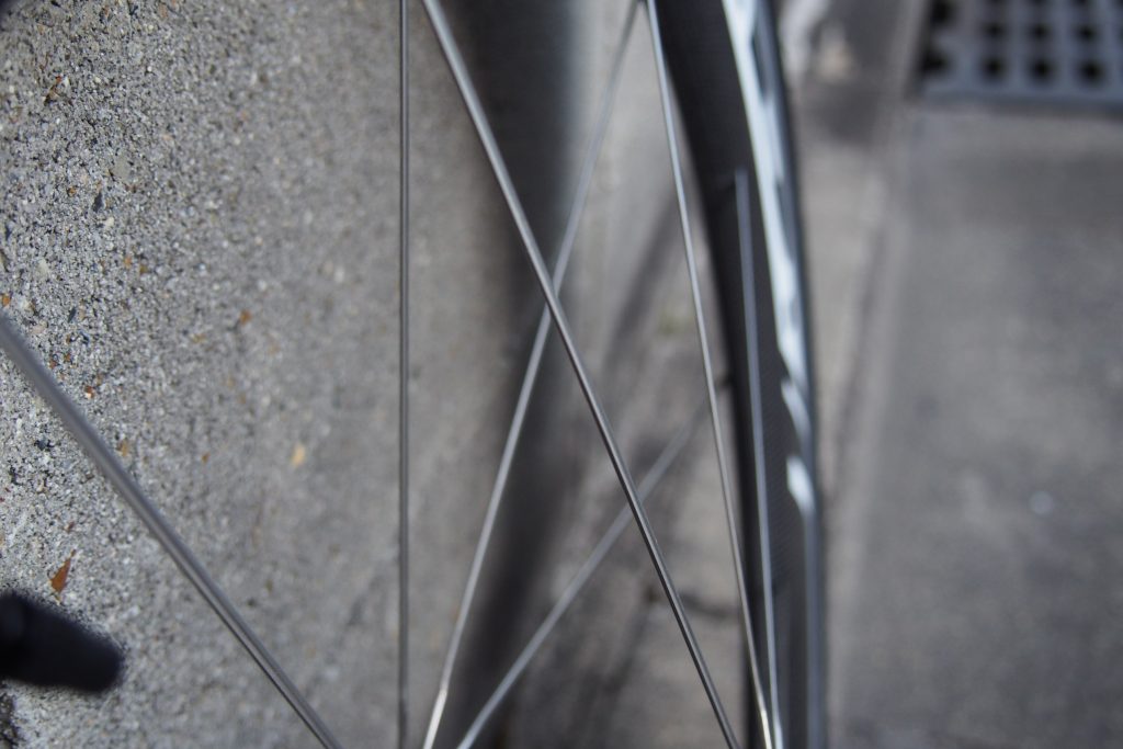 実際のスポークは中のアルミリムと固定されてますので、カーボンフードの横に穴をあけて、そこからスポークから出てくる形です。