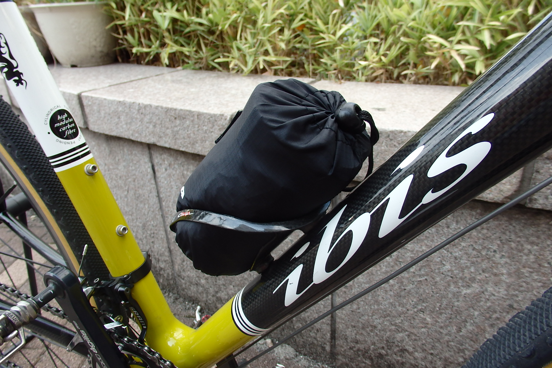 ご覧の通りボトルゲージにもすっぽりと収納可能なこのサイズ。撥水加工された40 デニール ナイロン採用でとってもコンパクト。シリアスなグラムカッターでなくとも、サイクリング~ツーリングにおける荷物は少なければ少ないほど単純に助かりますね。