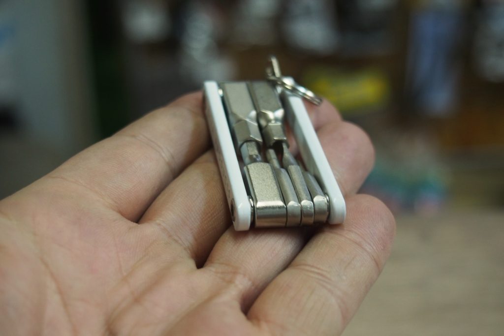 2.5,4,5,6mm、( + ) ドライバー、( – ) ドライバーがコンパクトにセットされ、信号待ちでちょいっとサドルやステムのポジション変更したりと、出先でちょいっと友達の自転車調整して一瞬重宝がられたり。何かと便利であります。