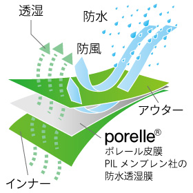 また、中間層のポレール被膜はGORE-TEX等と同じ透湿素材、外からの水の侵入は防ぎつつ内からの湿気の発散は可能とアクティブな場面には持ってこいの素材になっているので安心です。