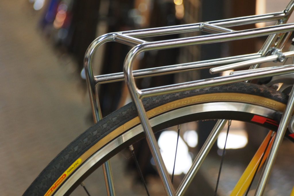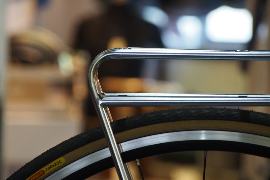 クロモリフレームをはじめとしたロードバイクやシクロクロス、グラベルバイクにもよく似あうスマートなフォルムのリアキャリア。