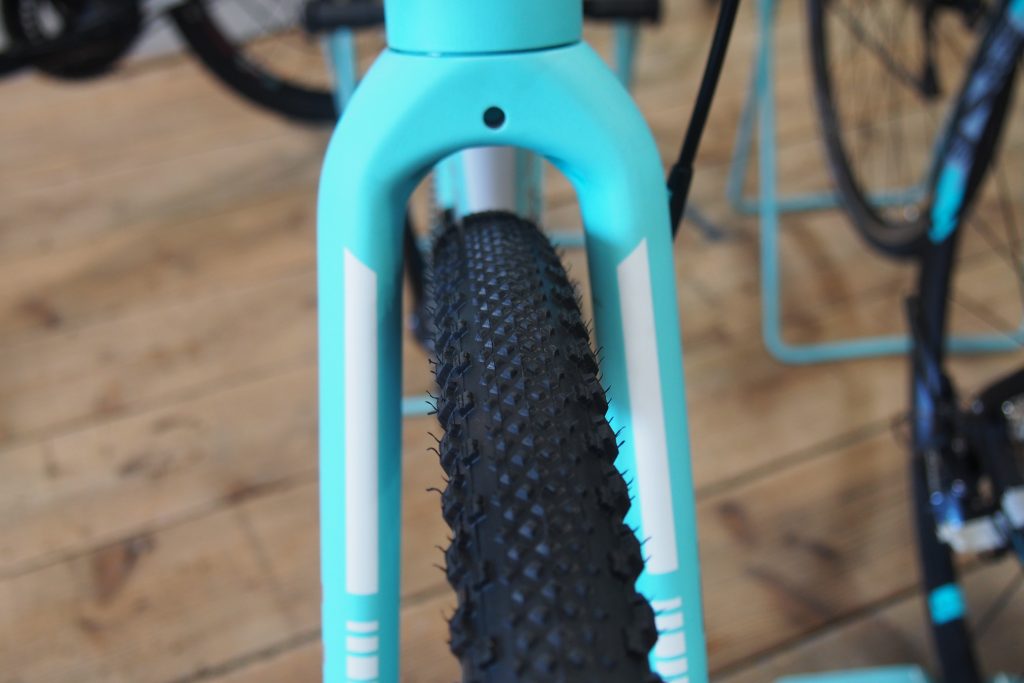 マットカラーのチェレステカラーに塗装された、ハイドロフォーミングチューブからなる美しいアルミフレームは、軽量かつ剛性面も充分。