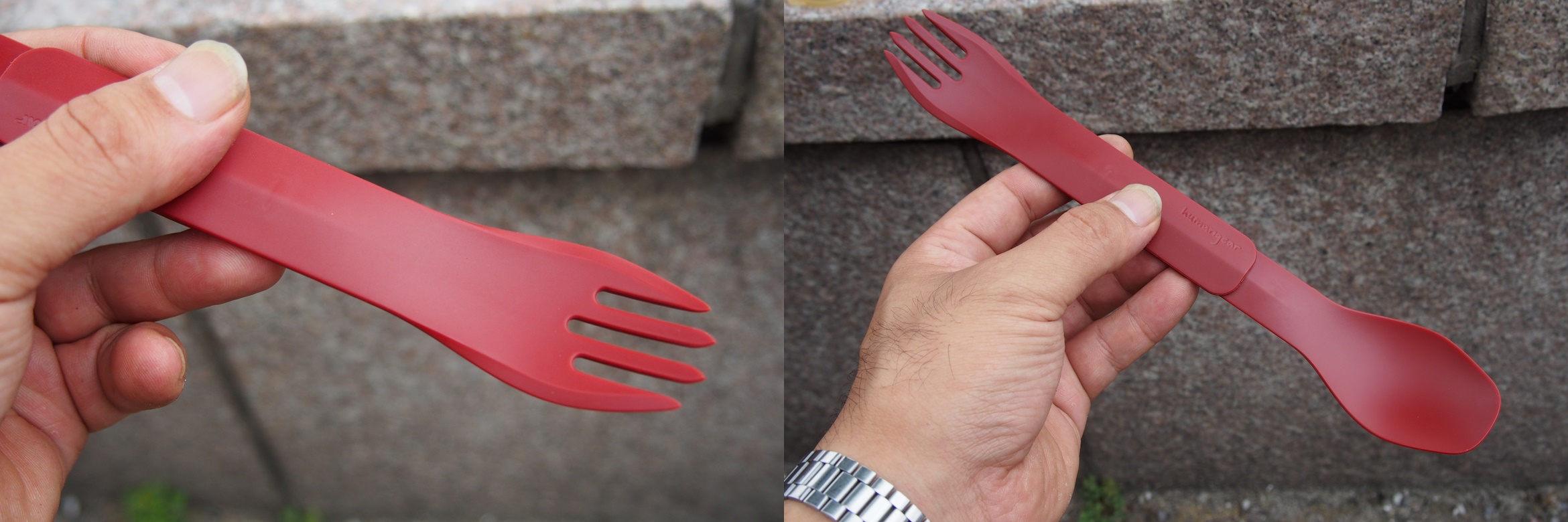 スプーンとフォークを連結することもできる事で底の深いクッカーの料理も食べやすく、フォーク部サイドは簡易的なナイフとしてもご使用いただけます。