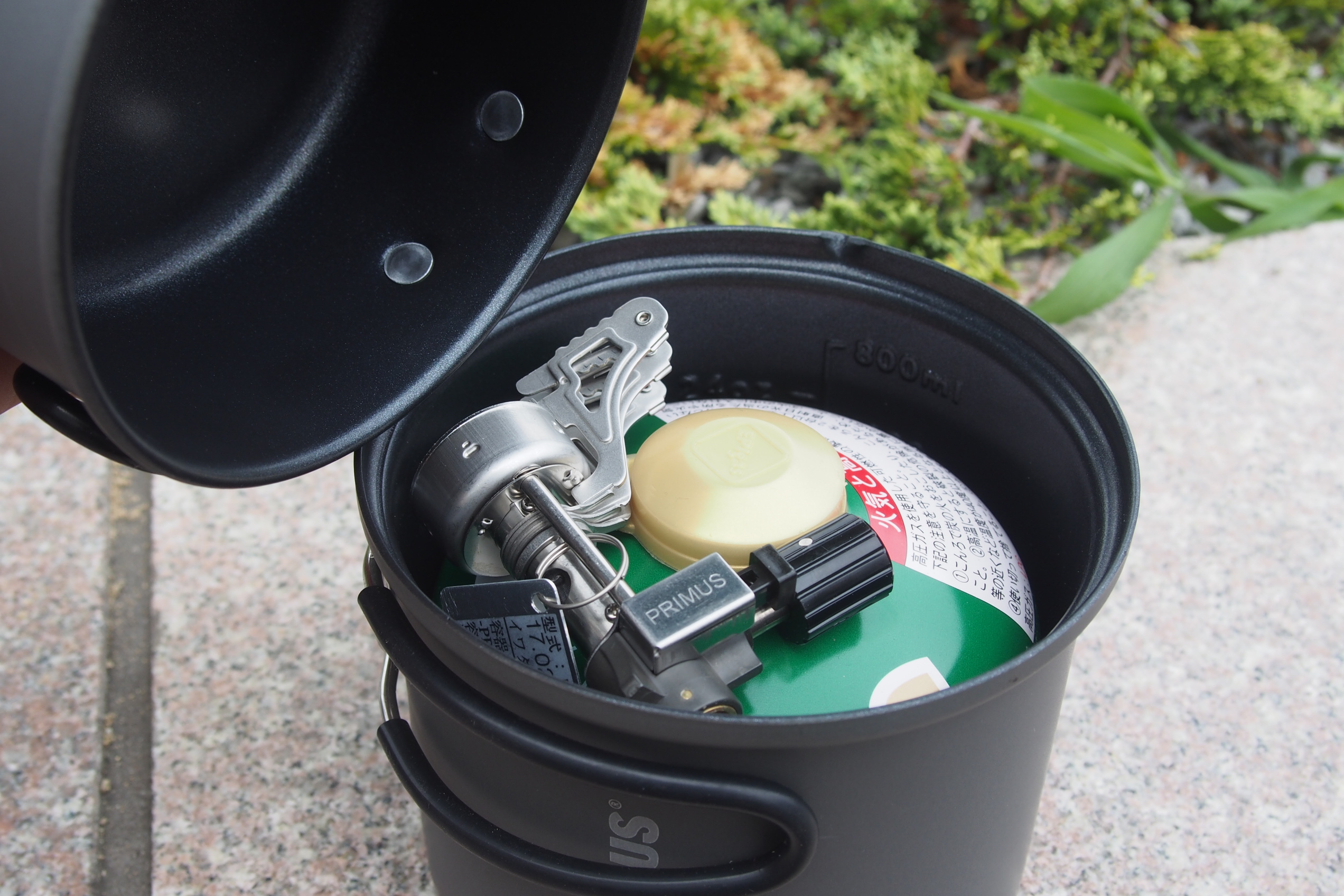 表面の耐食性を上げるための陽極処理をハードアノダイズド加工されております。前述の230サイズのカートリッジ、バーナーを内部に丁度収納できる、便利な2ピースセット。
