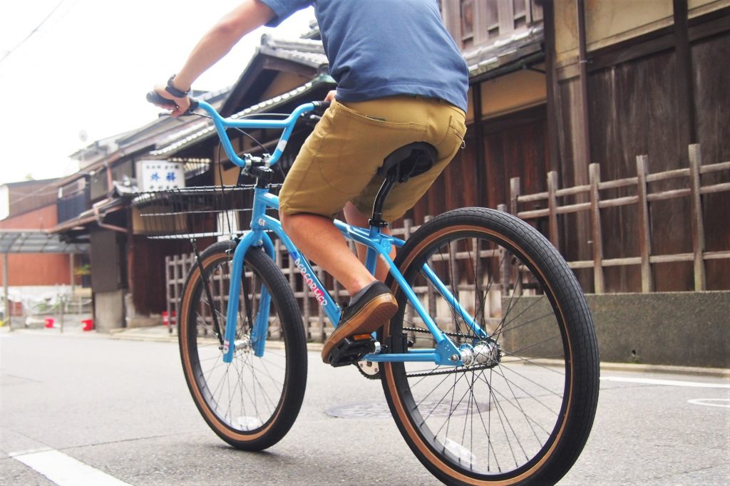 BMXはママチャリのように高いハンドル位置で楽ちんな乗車ポジションがとれ、視界を広く保つことができ、狭い路地からなどもある街中でも安心。またホイール径は通常の20インチ⇒26インチへ大径化された本モデルは、軽い漕ぎしろで巡行性も高く段差の乗り上げも安心です。